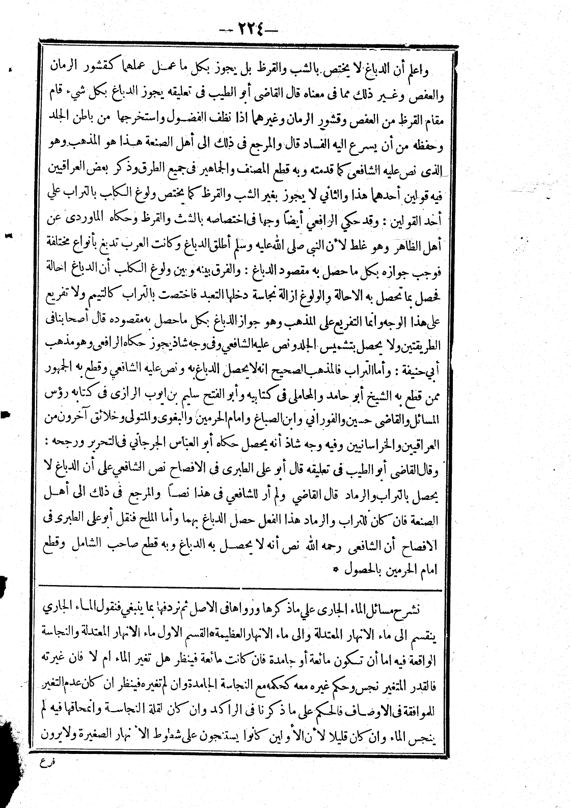 نشرح مسائل الماء الجارى علي ما ذكرها ورواها في الاصل ثم نردفها بما ينبغي فنقول الماء الجاري ينقسم إلى ماء الانهار المعتدلة وإلى ماء الانهار العظيمة * القسم الاول ماء الانهار المعتدلة والنجاسة الواقعة فيه اما أن تكون مائعة أو جامدة فان كانت مائعة فينظر هل تغير الماء ام لا فان غيرته فالقدر المتغير نجس وحكم غيره معه كحكمه مع النجاسة الجامدة وان لم تغيره فينظر ان كان عدم التغير للموافقة في الاوصاف فالحكم على ما ذكرنا في الراكد وان كان لقلة النجاسة وانمحاقها فيه لم ينجس الماء وان كان قليلا لان الاولين كانوا يستنجون على شطوط الانهار الصغيره ولا يرون