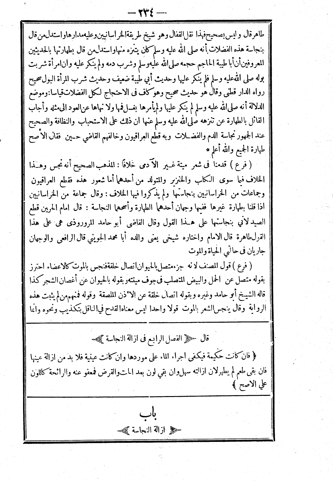 قال (الفصل الرابع في ازالة النجاسة) (فان كانت حكيمة فيكفى اجراء الماء على موردها وان كانت عينية فلابد من ازالة عينها فان بقى طعم لم يطهر لان ازالته سهل وان بقي لون بعد الحت والقرض فمعفو عنه والرائحة كاللون علي الاصح)
