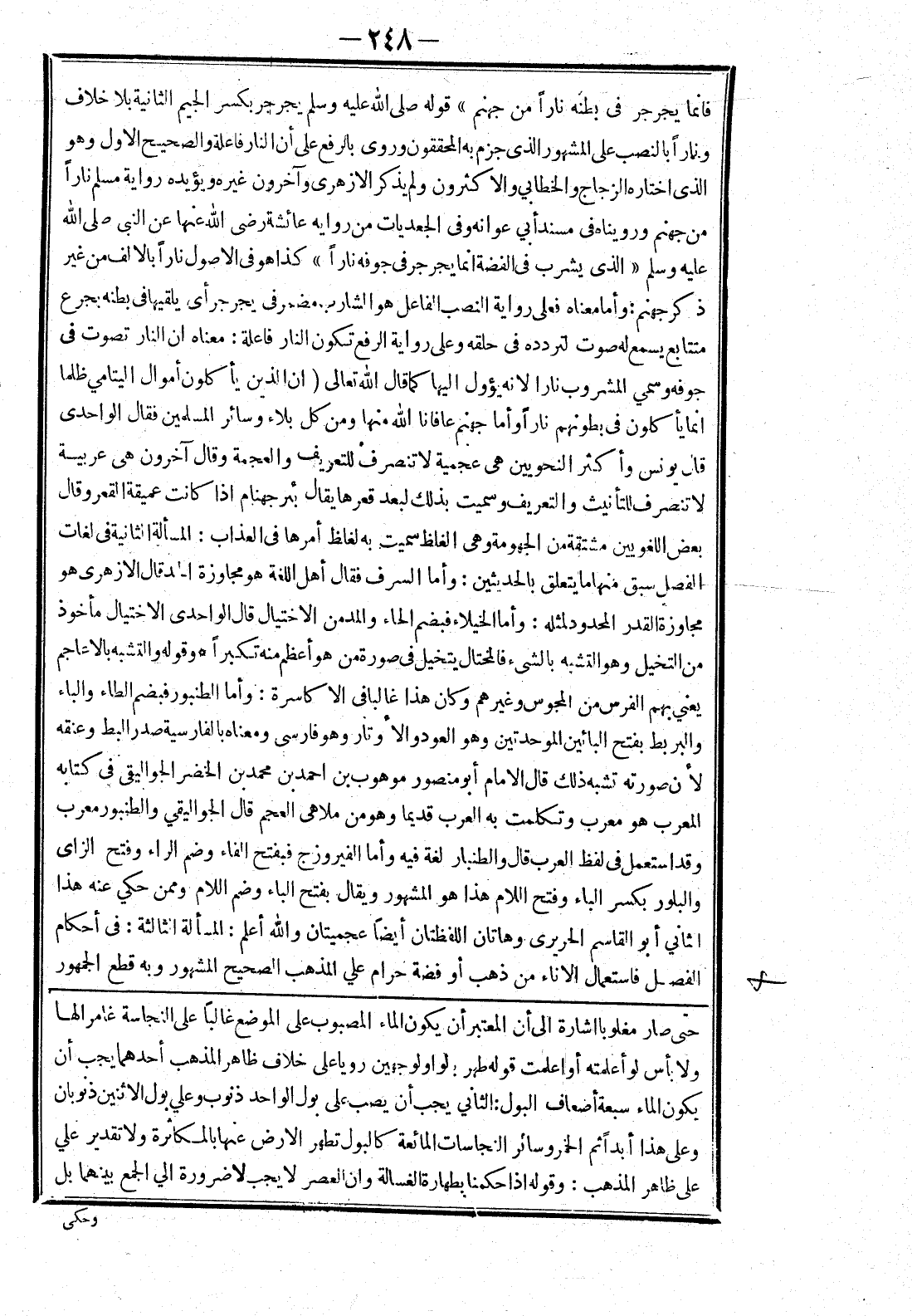 حتى صار مغلوبا اشارة إلى أن المعتبر أن يكون الماء المصبوب على الموضع غالبا على النجاسة غامرا لها ولا بأس لو أعلمته أو اعلمت قوله طهر: بالواو لوجهين رويا على خلاف ظاهر المذهب أحدهما يجب أن يكون الماء سبعة أضعاف البول: الثاني يجب أن يصب على بول الواحد ذنوب وعلي بول الاثنين ذنوبان وعلى هذا أبدا ثم الخمر وسائر النجاسات المائعة كالبول تطهر الارض عنها بالمكاثرة ولا تقدير علي على ظاهر المذهب: وقوله إذا حكمنا بطهارة الغسالة وان العصر لا يجب لا ضرورة الي الجمع بينهما بل
