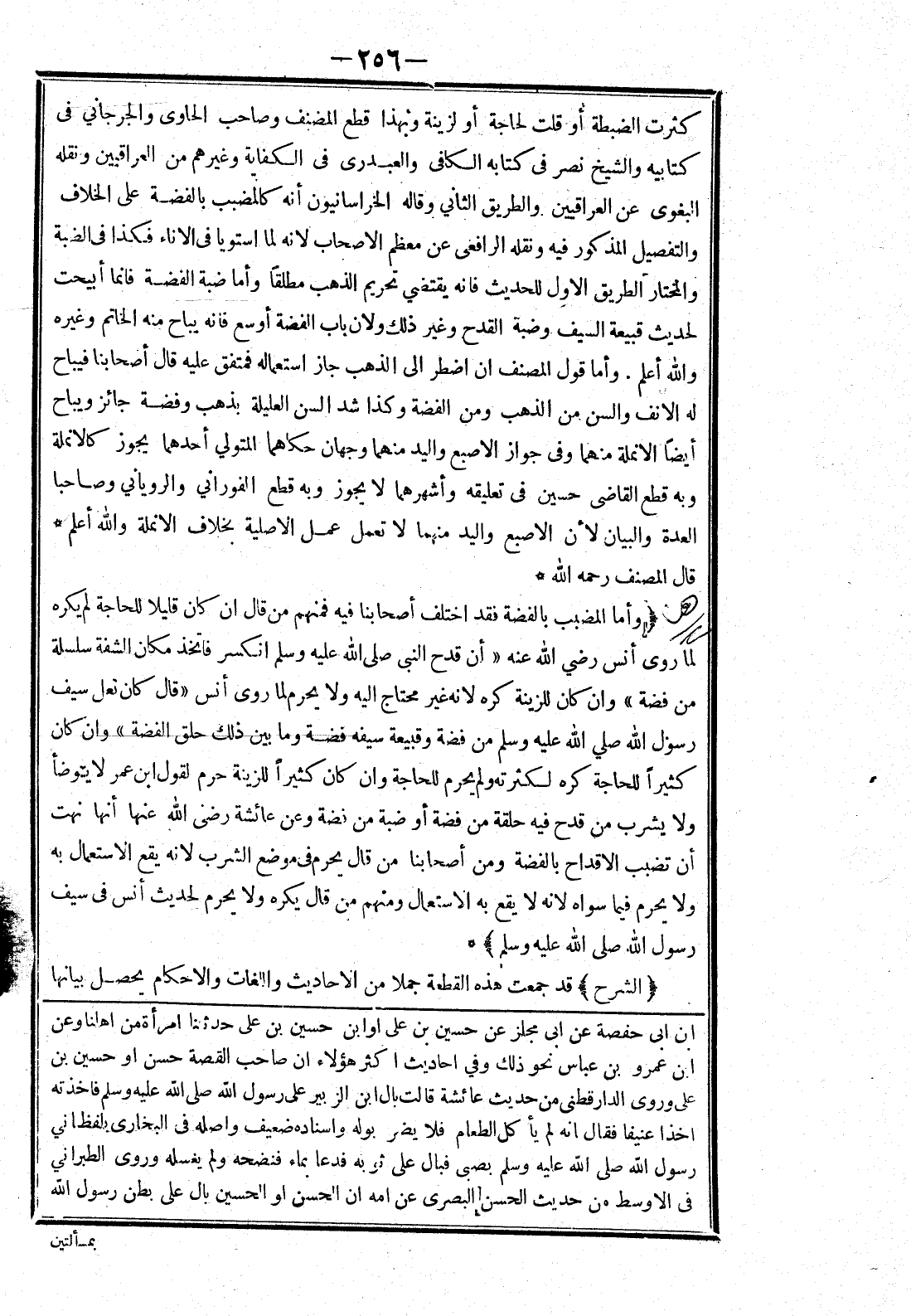 * (وَأَمَّا الْمُضَبَّبُ بِالْفِضَّةِ فَقَدْ اخْتَلَفَ أَصْحَابُنَا فِيهِ فَمِنْهُمْ مَنْ قَالَ إنْ كَانَ قَلِيلًا لِلْحَاجَةِ لَمْ يَكْرَهْ لِمَا رَوَى أَنَسٌ رَضِيَ اللَّهُ عَنْهُ أَنَّ قَدَحَ النَّبِيِّ صَلَّى اللَّهُ عَلَيْهِ وَسَلَّمَ انْكَسَرَ فَاتَّخَذَ مَكَانَ الشَّفَةِ سِلْسِلَةً مِنْ فِضَّةٍ وَإِنْ كَانَ لِلزِّينَةِ كُرِهَ لِأَنَّهُ غَيْرُ مُحْتَاجٍ إلَيْهِ وَلَا يَحْرُمُ لِمَا رَوَى أَنَسٌ قَالَ كَانَ نَعْلُ سَيْفِ رَسُولِ اللَّهِ صَلَّى اللَّهُ عَلَيْهِ وَسَلَّمَ مِنْ فِضَّةٍ وَقَبِيعَةُ سَيْفِهِ فِضَّةً وَمَا بَيْنَ ذَلِكَ حِلَقُ الْفِضَّةِ وَإِنْ كَانَ كَثِيرًا لِلْحَاجَةِ كُرِهَ لِكَثْرَتِهِ وَلَمْ يَحْرُمْ لِلْحَاجَةِ وَإِنْ كَانَ كَثِيرًا لِلزِّينَةِ حَرُمَ لِقَوْلِ ابْنِ عُمَرَ لَا يَتَوَضَّأُ وَلَا يَشْرَبُ مِنْ قَدَحٍ فِيهِ حَلْقَةٌ مِنْ فِضَّةٍ أَوْ ضَبَّةٌ مِنْ فِضَّةٍ وَعَنْ عَائِشَةَ رَضِيَ اللَّهُ عَنْهَا أَنَّهَا نَهَتْ أَنْ تُضَبَّبَ الْأَقْدَاحُ بِالْفِضَّةِ وَمِنْ أَصْحَابِنَا مَنْ قَالَ يَحْرُمُ فِي مَوْضِعِ الشُّرْبِ لِأَنَّهُ يَقَعُ الِاسْتِعْمَالُ بِهِ وَلَا يَحْرُمُ فِيمَا سِوَاهُ لِأَنَّهُ لَا يَقَعُ بِهِ الِاسْتِعْمَالُ وَمِنْهُمْ مَنْ قَالَ يُكْرَهُ وَلَا يَحْرُمُ لِحَدِيثِ أَنَسٍ فِي سَيْفِ رَسُولِ اللَّهِ صَلَّى اللَّهُ عَلَيْهِ وَسَلَّمَ)