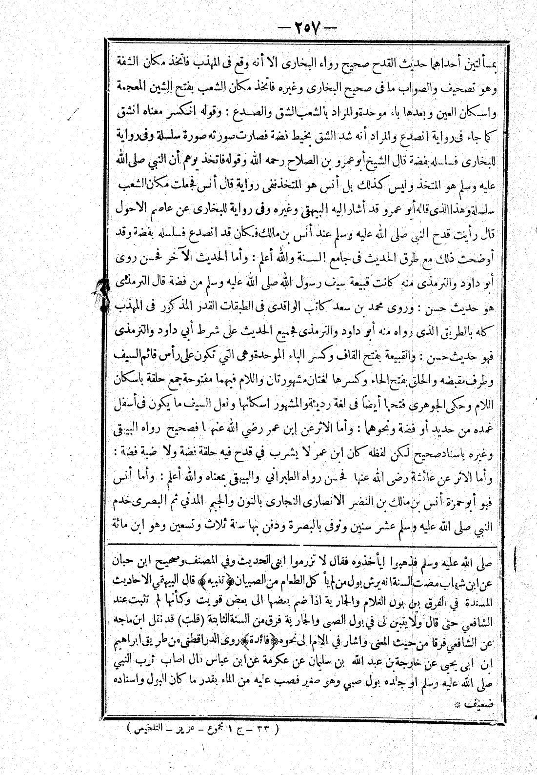 هُوَ حَدِيثٌ حَسَنٌ: وَرَوَى مُحَمَّدُ بْنُ سَعْدٍ كَاتِبُ الْوَاقِدِيِّ فِي الطَّبَقَاتِ الْقَدْرَ الْمَذْكُورَ فِي الْمُهَذَّبِ كُلَّهُ بِالطَّرِيقِ الَّذِي رَوَاهُ مِنْهُ أَبُو دَاوُد وَالتِّرْمِذِيُّ فَجَمِيعُ الْحَدِيثِ عَلَى شَرْطِ أَبِي دَاوُد وَالتِّرْمِذِيِّ فَهُوَ حَدِيثٌ حَسَنٌ: وَالْقَبِيعَةُ بِفَتْحِ الْقَافِ وَكَسْرِ الْبَاءِ الْمُوَحَّدَةِ وَهِيَ الَّتِي تَكُونُ عَلَى رَأْسٍ قَائِمِ السَّيْفِ وَطَرَفِ مِقْبَضِهِ وَالْحَلَقُ بِفَتْحِ الْحَاءِ وَكَسْرِهَا لُغَتَانِ مَشْهُورَتَانِ وَاللَّامُ فِيهِمَا مَفْتُوحَةٌ جَمْعُ حَلْقَةٍ بِإِسْكَانِ اللَّامِ وَحَكَى الْجَوْهَرِيُّ فَتْحَهَا أَيْضًا فِي لُغَةٍ رَدِيئَةٍ وَالْمَشْهُورُ اسكانها وفعل السَّيْفِ مَا يَكُونُ فِي أَسْفَلِ غِمْدِهِ مِنْ حَدِيدٍ أَوْ فِضَّةٍ وَنَحْوِهِمَا: وَأَمَّا الْأَثَرُ عَنْ ابن عمر رضي الله عنها فَصَحِيحٌ رَوَاهُ الْبَيْهَقِيُّ وَغَيْرُهُ بِإِسْنَادٍ صَحِيحٍ لَكِنَّ لَفْظَهُ كَانَ ابْنُ عُمَرَ لَا يَشْرَبُ فِي قَدَحٍ فِيهِ حَلْقَةُ فِضَّةٍ وَلَا ضَبَّةُ فِضَّةٍ: وَأَمَّا الْأَثَرُ عَنْ عَائِشَةَ رَضِيَ اللَّهُ عَنْهَا فَحَسَنٌ رَوَاهُ الطَّبَرَانِيُّ وَالْبَيْهَقِيُّ بِمَعْنَاهُ وَاَللَّهُ أَعْلَمُ: وَأَمَّا أَنَسٌ فَهُوَ أَبُو حَمْزَةَ أَنَسُ بْنُ مَالِكِ بْنُ النَّضْرِ الْأَنْصَارِيُّ النَّجَّارِيُّ بِالنُّونِ وَالْجِيم الْمَدَنِيُّ ثُمَّ الْبَصْرِيُّ خَدَمَ النَّبِيَّ صَلَّى اللَّهُ عَلَيْهِ وَسَلَّمَ عَشْرَ سِنِينَ وَتُوُفِّيَ بِالْبَصْرَةِ وَدُفِنَ بِهَا سَنَةَ ثَلَاثٍ وَتِسْعِينَ وَهُوَ ابْنُ مِائَةٍ