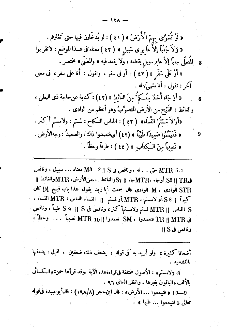 (1) «لامستم» : الأصول مختلفة فى قراءة هذه الآية، وقد قرأها حمزة والكسائي بالألف والباقون بغيرها، وانظر الداني 96.