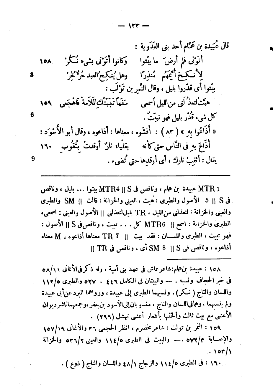 (1) عبيدة بن همام: شاعر عاش فى عهد بنى أمية، وله ذكر فى الأغانى 11/ 58 فى خبر الحجاف ونسبه. - والبيتان فى الكامل 446، 527 والطبري 5/ 112 واللسان والتاج (نكر) . ونسبهما الطبري إلى عبيدة، ورواهما المبرد عن أبى عبيدة ولم ينسبهما، وهما فى اللسان والتاج، منسوبان إلى الأسود بن يعفر، وجمعهما ناشر ديوان الأعشى مع بيت ثالث وألحقها بأشعار أعشى نهشل (296) .