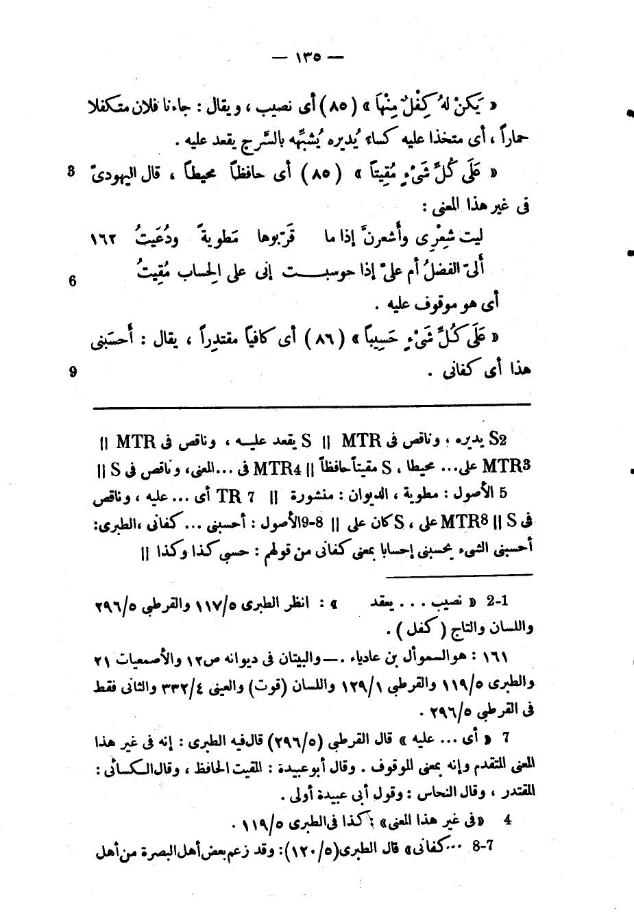 (4) «أي ... عليه» قال القرطبي (5/ 296) قال فيه الطبري: إنه فى غير هذا المعنى المتقدم وإنه بمعنى الموقوف. وقال أبو عبيدة: المقيت الحافظ، وقال الكسائي: