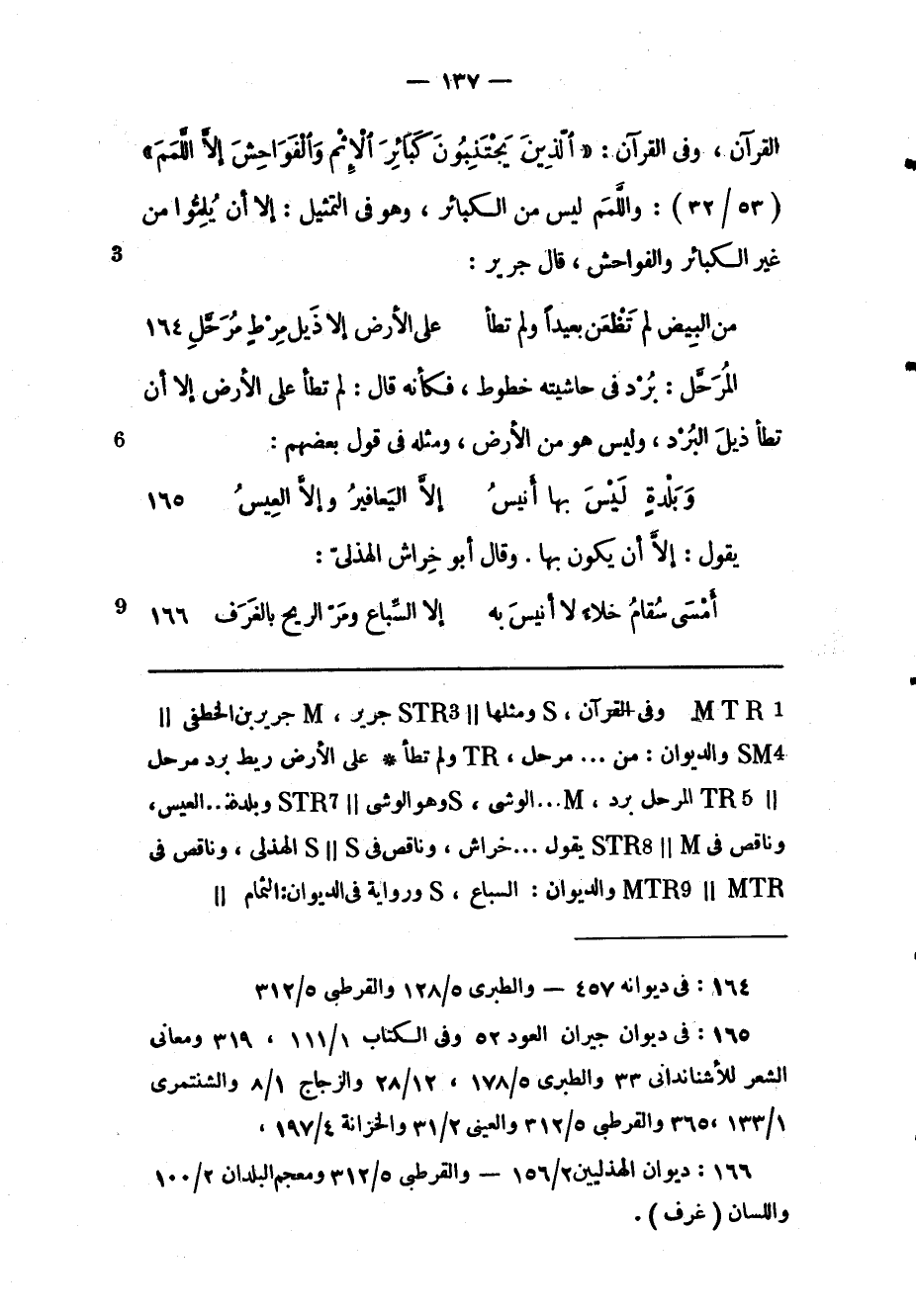 القرآن، وفى القرآن: «الَّذِينَ يَجْتَنِبُونَ كَبائِرَ الْإِثْمِ وَالْفَواحِشَ إِلَّا اللَّمَمَ» (53/ 32) : واللّمم ليس من الكبائر، وهو فى التمثيل: إلا أن يلمّوا من غير الكبائر والفواحش، قال جرير: