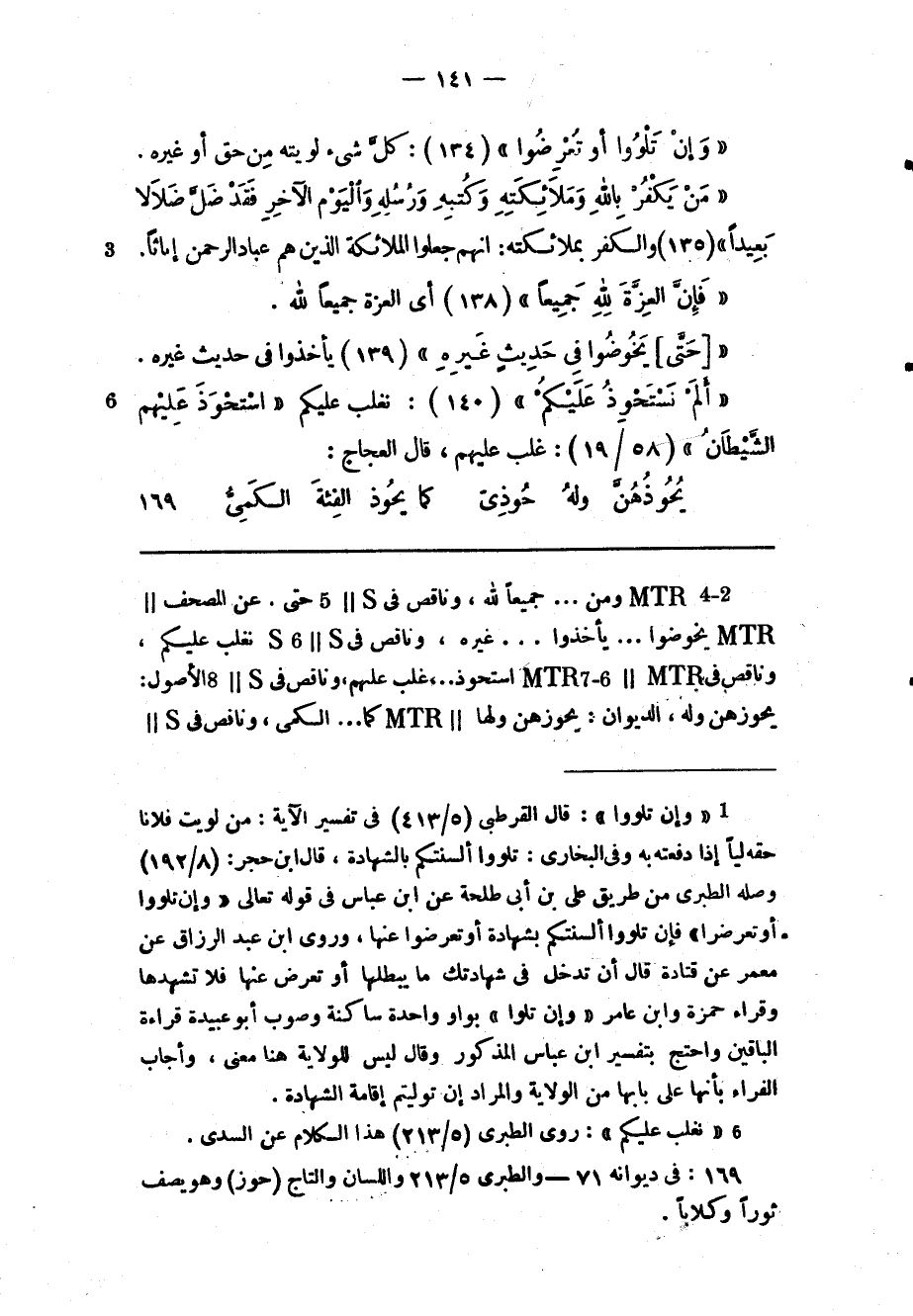 (1) «وإن تلووا» : قال القرطبي (5/ 413) فى تفسير الآية: من لويت فلانا حقه ليا إذا دفعته به وفى البخاري: تلووا ألسنتكم بالشهادة، قال ابن حجر: (8/ 192) وصله الطبري من طريق على بن أبى طلحة عن ابن عباس فى قوله تعالى «وَإِنْ تَلْوُوا- أَوْ تُعْرِضُوا» فإن تلووا ألسنتكم بشهادة أو تعرضوا عنها، وروى ابن عبد الرزاق عن معمر عن قتادة قال أن تدخل فى شهادتك ما يبطلها أو تعرض عنها فلا تشهدها وقراء حمزة وابن عامر «وإن تلوا» بواو واحدة ساكنة وصوب أبو عبيدة قراءة الباقين واحتج بتفسير ابن عباس المذكور وقال ليس للولاية هنا معنى، وأجاب الفراء بأنها على بابها من الولاية والمراد إن توليتم إقامة الشهادة.