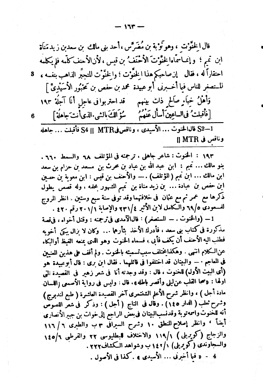 (2) (والخنوت. - المستصغر) : قال الآمدى فى ترجمته: وقتل أخواه، فى قصة مذكورة فى كتاب بنى سعد، فأدرك الأخذ بثأرهما ... وكان لا يزال يبكى أخويه فطلب إليه الأحنف أن يكف فأبى، فسماه الخنوت وهو الذي يمنعه الغيظ أو البكاء عن الكلام انتهى. وهكذا يختلف سبب تسميته بالخنوت. ولم أقف على هذين المعنيين فى المعاجم. - والبيتان قد اختلفوا فى قائلهما. فقال ابن برى: قال أبو عبيدة هو (أي البيت الأول) للخنوت، قال: وقد وجدته أنا فى شعر زهير فى القصيدة التي أولها: «صحا القلب عن ليلى وأقصر باطله» ، قال: وليس فى رواية الأصمعى (اللسان مادة أجل) ، وانظر شرح الأعلم الشنتمرى آخر القصيدة العاشرة (طبع لندبرج) وشرح ثعلب (الدار 145) . وقال فى التاج (أجل) : وذكر فى شعر اللصوص أنه للخنوت واسمه توبة وقد نسب البيتان فى بعض المراجع إلى خوات بن جبير الأنصاري أيضا، وانظر إصلاح المنطق 10 وشرح السيرافي 3 ب والطبري 6/ 116 والزجاج (كوپريلى) 1/ 119 والاختلاف للبطليوسى 22 والقرطبي 6/ 145 والسجاوندى (كوپريلى) 1/ 142 ب وشواهد الكشاف 222.