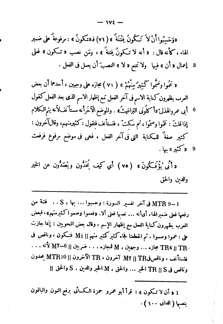 «عَمُوا وَصَمُّوا كَثِيرٌ مِنْهُمْ» (71) مجازه على وجهين، أحدهما أن بعض العرب يظهرون كناية الاسم فى آخر الفعل مع إظهار الاسم الذي بعد الفعل كقول أبى عمرو الهذلي «أكلونى البراغيث» والموضع الآخر أنه مستأنف لأنه يتم الكلام إذا قلت: عموا وصمّوا، ثم سكتّ، فتستأنف فتقول: كثير منهم، وقال آخرون: