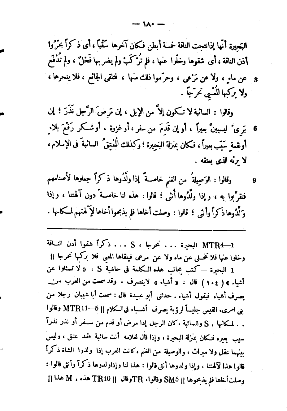 البحيرة أنّها إذا نتجت الناقة خمسة أبطن فكان آخرها سقبا، أي ذكرا بحّروا أذن الناقة، أي شقوها وخلّوا عنها، فلم تركب ولم يضربها فحل، ولم تدفع عن ماء، ولا عن مرعى، وحرّموا ذلك منها، فتلقى الجائع، فلا ينحرها، ولا يركبها المعيى تحرّجا.