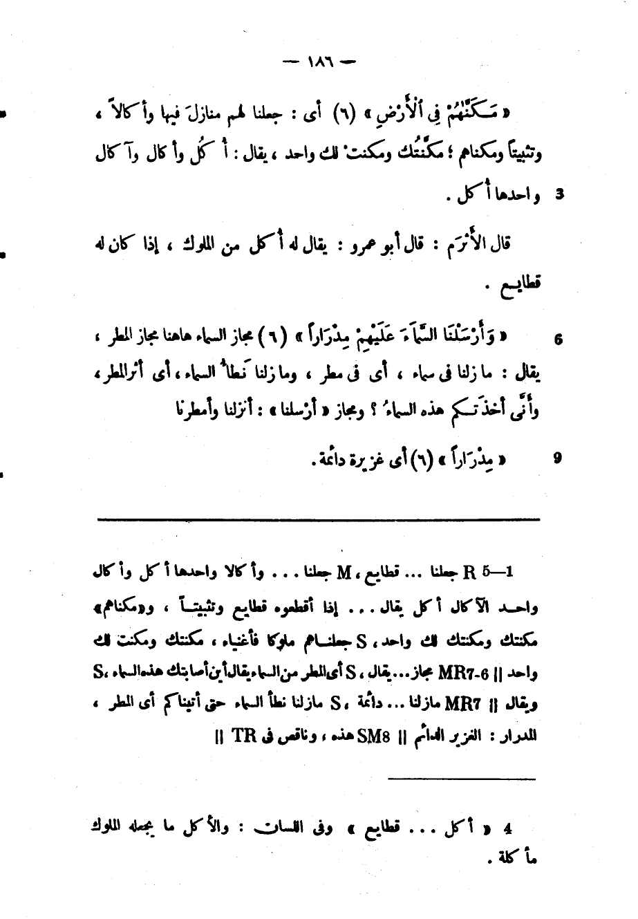 «مَكَّنَّاهُمْ فِي الْأَرْضِ» (6) أي: جعلنا لهم منازل فيها وأكالا، وتثبيتا ومكناهم مكّنتك ومكنت لك واحد، يقال: أكل وأكال وآكال واحدها أكل.