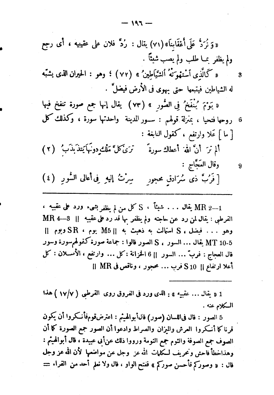 (2) الصور: قال فى اللسان (صور) قال أبو الهيثم: اعترض قوم فأنكروا أن يكون قرنا كما أنكروا العرش والميزان والصراط وادعوا أن الصور جمع الصورة كما أن الصوف جمع الصوفة والثوم جمع النومة ورووا ذلك عن أبى عبيدة، قال أبو الهيثم: