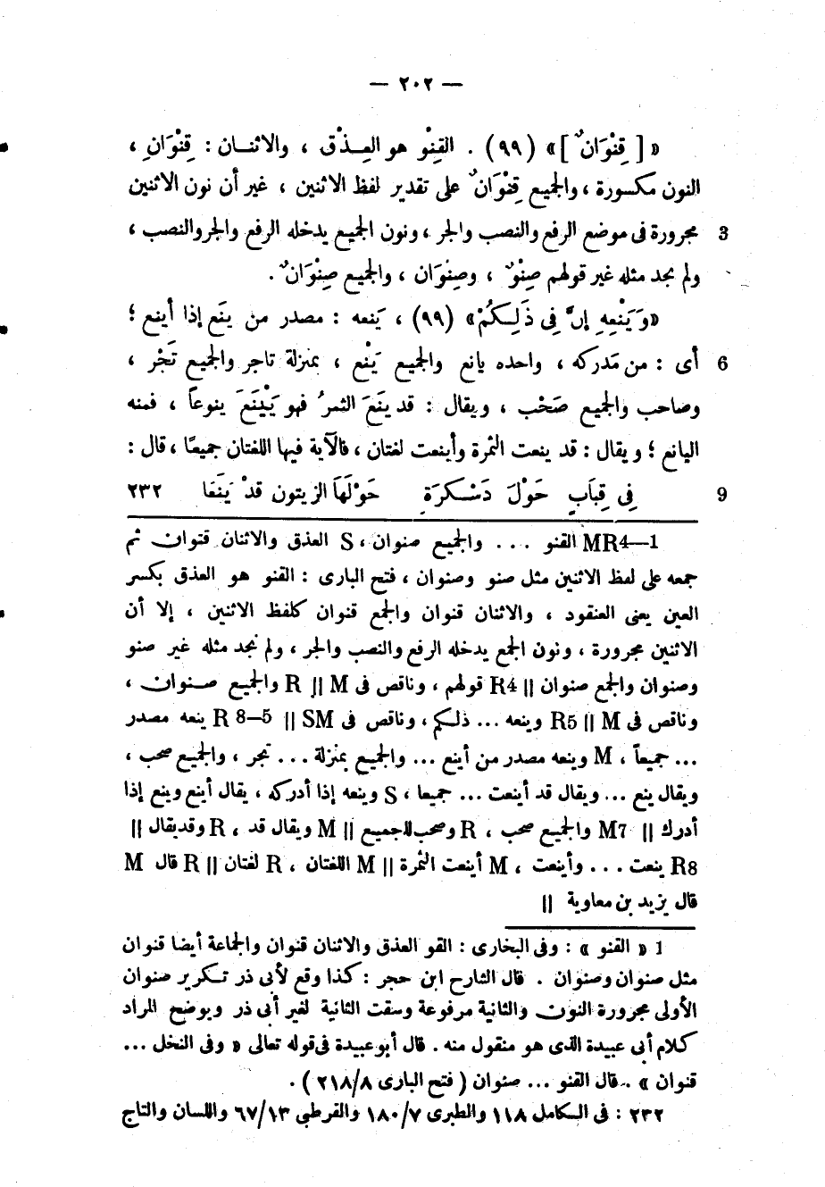 (1) «القنو» : وفى البخاري: القنو العذق والاثنان قنوان والجماعة أيضا قنوان مثل صنوان وصنوان. قال الشارح ابن حجر: كذا وقع لأبى ذر تكرير صنوان الأولى مجرورة النون والثانية مرفوعة وسقت الثانية لغير أبى ذر ويوضح المراد كلام أبى عبيدة الذي هو منقول منه. قال أبو عبيدة فى قوله تعالى «وَمِنَ النَّخْلِ ...