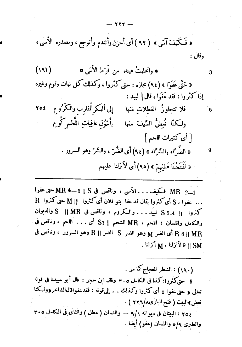 (2) حتى كثروا: كذا فى الكامل 305 وقال ابن حجر: قال أبو عبيدة فى قوله تعالى «حتى عفوا» أي كثروا وكذلك ... إلى قوله: فقد عفوا قال الشاعر «ولكنا نعض» البيت (فتح الباري 8/ 226) .