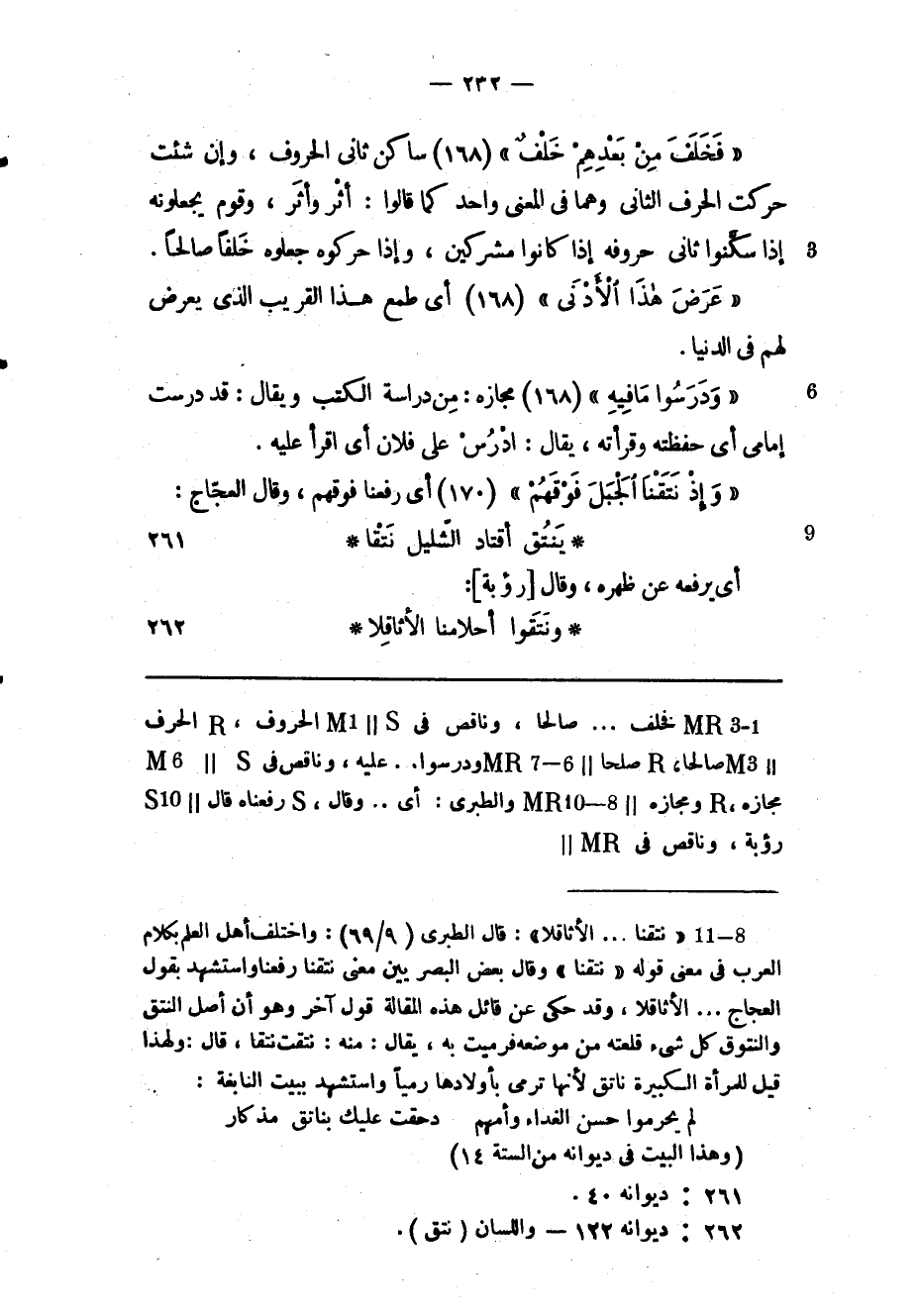 (1) «نتقنا ... الأثاقلا» : قال الطبري (9/ 69) : واختلف أهل العلم بكلام العرب فى معنى قوله «نتقنا» وقال بعض البصريين معنى نتقنا رفعنا واستشهد بقول العجاج ... الأثاقلا، وقد حكى عن قائل هذه المقالة قول آخر وهو أن أصل النتق والنتوق كل شىء قلعته من موضعه فرميت به، يقال: منه: نتقت نتقا، قال: ولهذا قيل للمرأة الكبيرة ناتق لأنها ترمى بأولادها رميا واستشهد ببيت النابغة: