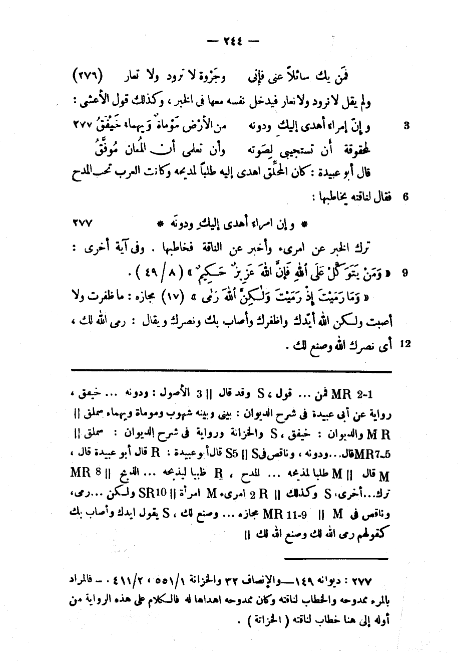 (1) : ديوانه 149- والإنصاف 32 والخزانة 1/ 551، 2/ 411. - فالمراد بالمرء ممدوحه والخطاب لناقته وكان ممدوحه أهداها له فالكلام على هذه الرواية من أوله إلى هنا خطاب لناقته (الخزانة) .