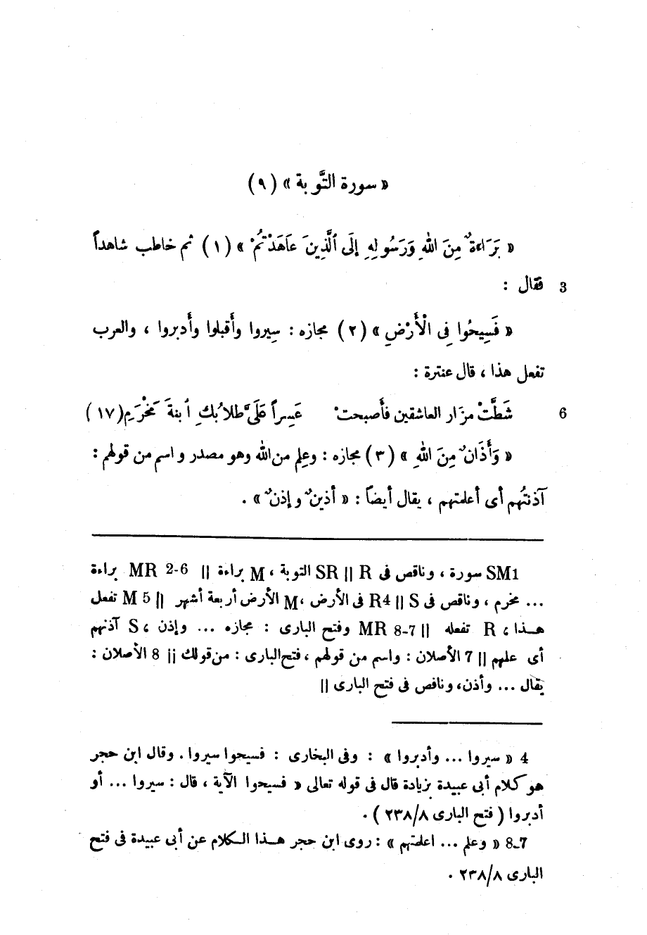 (1) «سيروا ... وأدبروا» : وفى البخاري: فسيحوا سيروا. وقال ابن حجر هو كلام أبى عبيدة بزيادة قال فى قوله تعالى «فسيحوا الآية، قال: سيروا ... أو أدبروا (فتح الباري 8/ 238) .