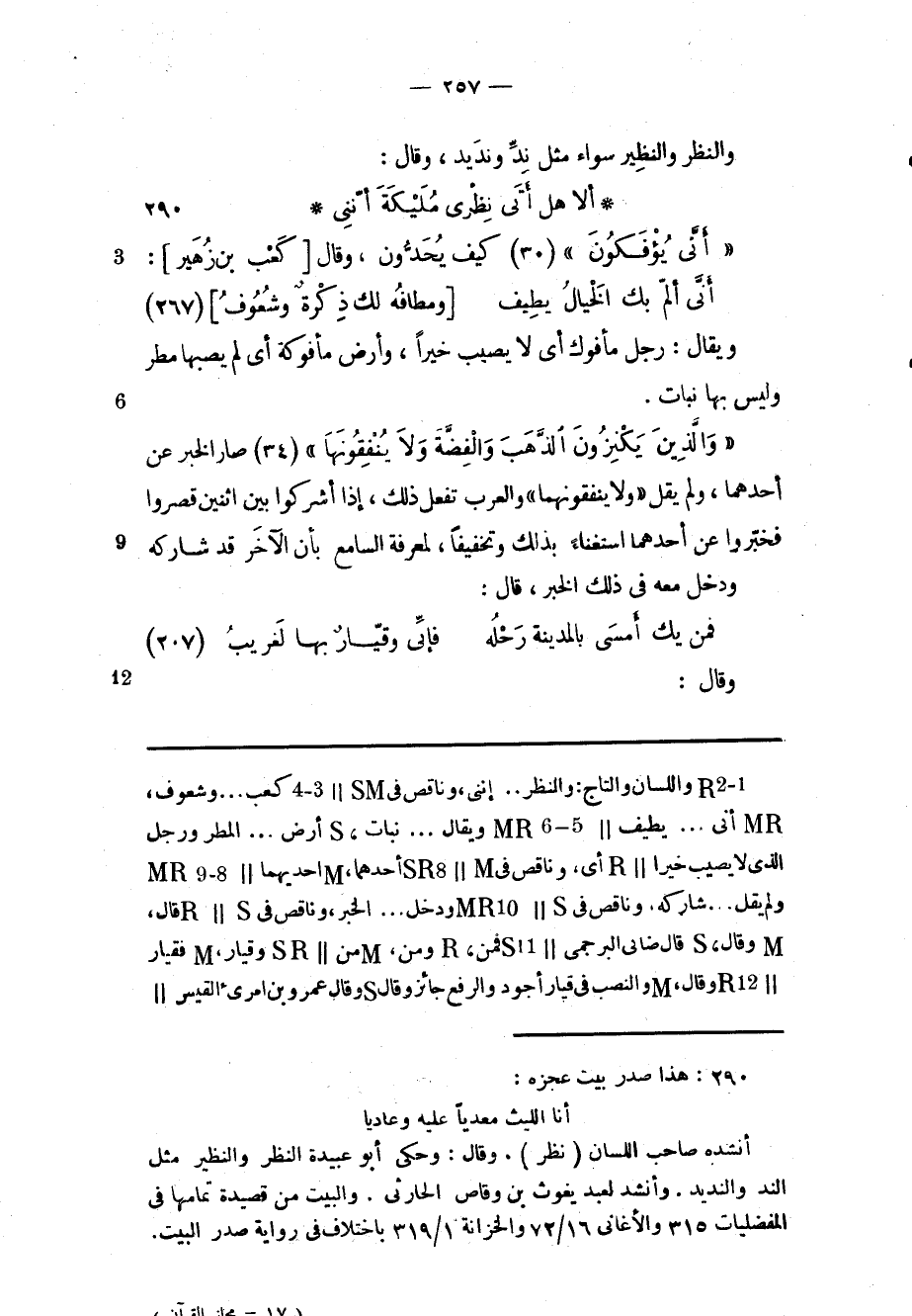 «وَالَّذِينَ يَكْنِزُونَ الذَّهَبَ وَالْفِضَّةَ وَلا يُنْفِقُونَها» (34) صار الخبر عن أحدهما، ولم يقل «ولا ينفقونهما» والعرب تفعل ذلك، إذا أشركوا بين اثنين قصروا فخبّروا عن أحدهما استغناء بذلك وتخفيفا، لمعرفة السامع بأن الآخر قد شاركه ودخل معه فى ذلك الخبر، قال: