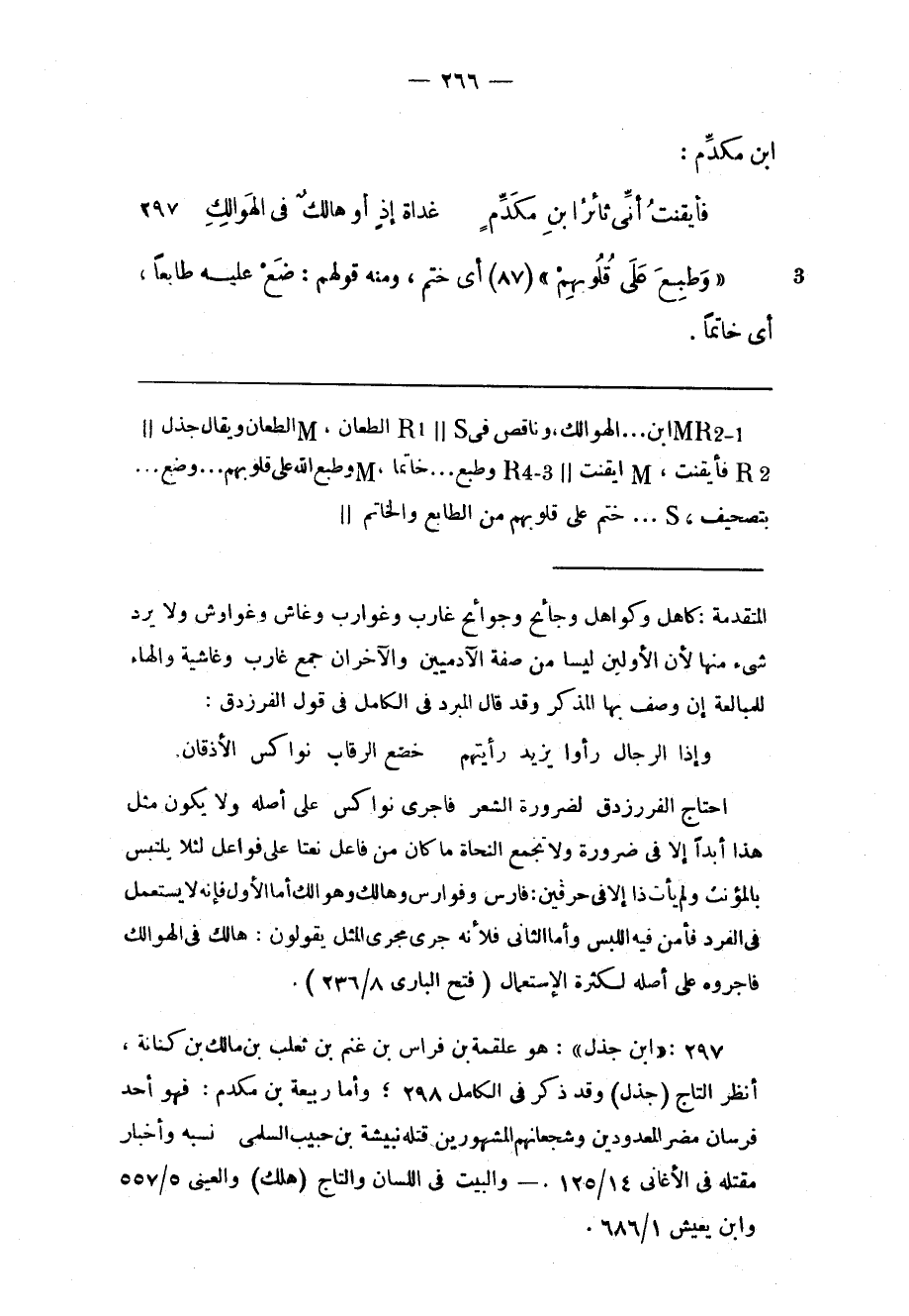 (1) : «ابن جذل» : هو علقمة بن فراس بن غنم بن ثعلب بن مالك بن كنانة، أنظر التاج (جذل) وقد ذكر فى الكامل 298 وأما ربيعة بن مكدم: فهو أحد فرسان مضر المعدودين وشجعانهم المشهورين قتله نبيشة بن حبيب السلمى نسبه وأخبار مقتله فى الأغانى 14/ 125. - والبيت فى اللسان والتاج (هلك) والعيني 5/ 557 وابن يعيش 1/ 686.