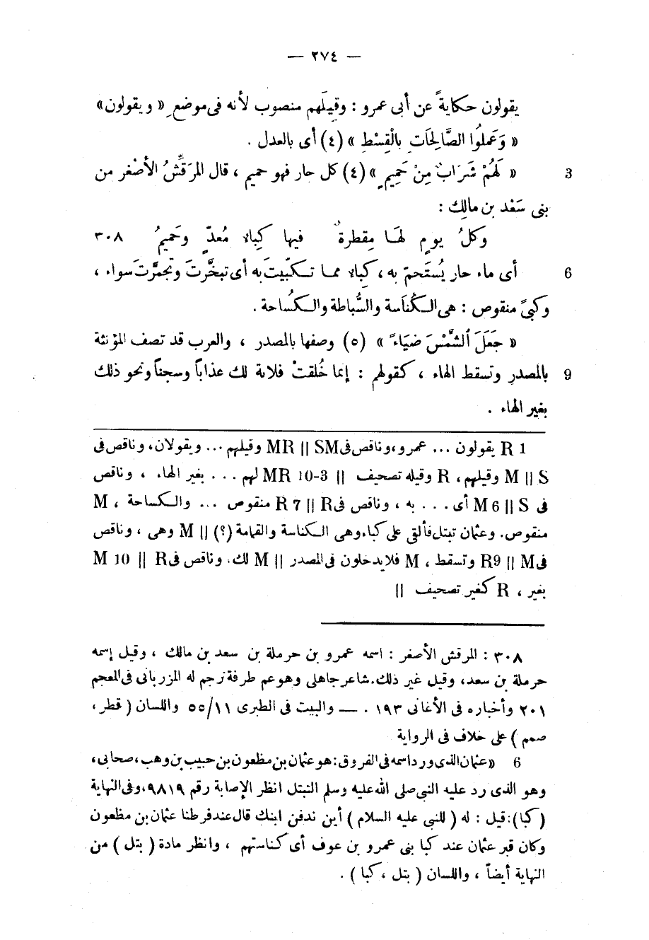 (1) المرقش الأصغر: اسمه عمرو بن حرملة بن سعد بن مالك، وقيل اسمه حرملة بن سعد، وقيل غير ذلك. شاعر جاهلى وهو عم طرفة ترجم له المرزباني فى المعجم 201 وأخباره فى الأغانى 193. - والبيت فى الطبري 11/ 55 واللسان (قطر، صمم) على خلاف فى الرواية