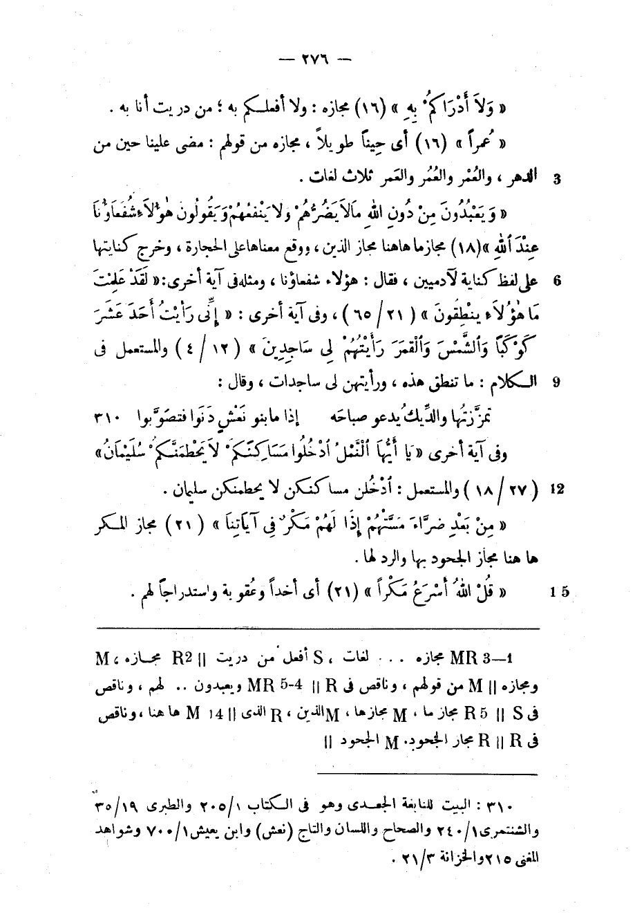 «وَيَعْبُدُونَ مِنْ دُونِ اللَّهِ ما لا يَضُرُّهُمْ وَلا يَنْفَعُهُمْ وَيَقُولُونَ هؤُلاءِ شُفَعاؤُنا عِنْدَ اللَّهِ» (18) مجاز ما هاهنا مجاز الدين، ووقع معناها على الحجارة، وخرج كنايتها على لفظ كناية لآدميين، فقال: هؤلاء شفعاؤنا، ومثله فى آية أخرى: «لَقَدْ عَلِمْتَ ما هؤُلاءِ يَنْطِقُونَ» (21/ 65) ، وفى آية أخرى: «إِنِّي رَأَيْتُ أَحَدَ عَشَرَ كَوْكَباً وَالشَّمْسَ وَالْقَمَرَ رَأَيْتُهُمْ لِي ساجِدِينَ» (12/ 4) والمستعمل فى الكلام: ما تنطق هذه، ورأيتهن لى ساجدات، وقال: