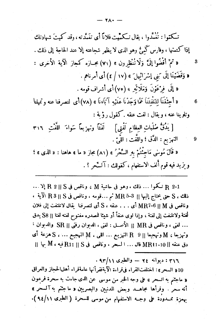 (2) «السحر» : اختلفت القراء فى قراءة الآية فقرأتها عامة قراء أهل الحجاز والعراق «ما جِئْتُمْ بِهِ السِّحْرُ» على وجه الخبر من موسى عن الذي جاءت به سحرة فرعون أنه سحر. وقرأها مجاهد وبعض المدنيين والبصريين «ما جِئْتُمْ بِهِ السِّحْرُ» بهمزة ممدودة على وجه الاستفهام من موسى للسحرة (الطبري 11/ 94) .