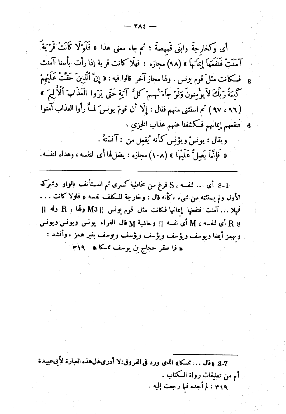 أي وكخارجة وابني قبيصة ثم جاء معنى هذا «فَلَوْلا كانَتْ قَرْيَةٌ آمَنَتْ فَنَفَعَها إِيمانُها» (98) مجازه: فهلّا كانت قرية إذا رأت بأسنا آمنت فكانت مثل قوم يونس. ولها مجاز آخر قالوا فيه: «إِنَّ الَّذِينَ حَقَّتْ عَلَيْهِمْ كَلِمَتُ رَبِّكَ لا يُؤْمِنُونَ وَلَوْ جاءَتْهُمْ كُلُّ آيَةٍ حَتَّى يَرَوُا الْعَذابَ الْأَلِيمَ» (96، 97) ثم استثنى منهم فقال: إلّا أن قوم يونس لمّا رأوا العذاب آمنوا فنفعهم إيمانهم فكشفنا عنهم عذاب الخزي.