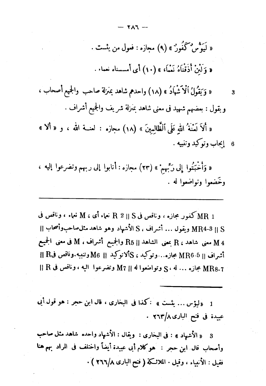 (2) «الأشهاد» : فى البخاري: ويقال: الأشهاد واحده شاهد مثل صاحب وأصحاب قال ابن حجر: هو كلام أبى عبيدة أيضا واختلف فى المراد بهم هنا فقيل: الأنبياء، وقيل. الملائكة (فتح الباري 8/ 266) .