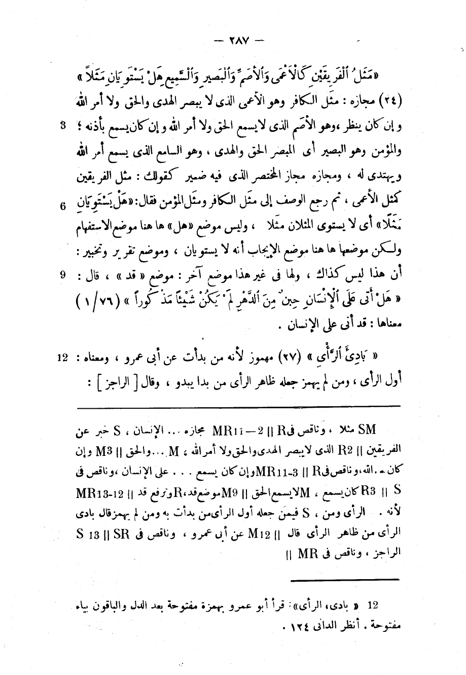 (1) «بادى، الرأى» : قرأ أبو عمرو بهمزة مفتوحة بعد الدل والباقون بياء مفتوحة. أنظر الداني 124.