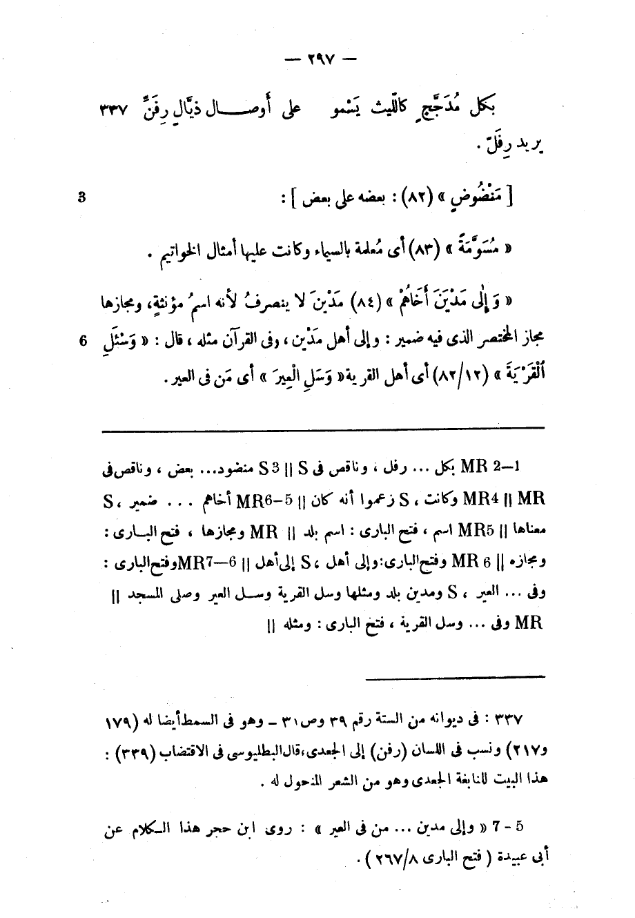 «وَإِلى مَدْيَنَ أَخاهُمْ» (84) مدين لا ينصرف لأنه اسم مؤنثة، ومجازها مجاز المختصر الذي فيه ضمير: وإلى أهل مدين، وفى القرآن مثله، قال: «وَسْئَلِ الْقَرْيَةَ» (12/ 82) أي أهل القرية «وسئل العير» أي من فى العير. «2»
