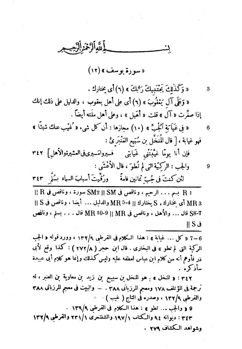 (1) «كل ... غيابة» : هذا الكلام فى القرطبي 9/ 132، وورد قوله «الجب الركية التي لم تطو» فى البخاري. قال ابن حجر (8/ 272) : كذا وقع لأبى ذر فأوهم أنه من كلام ابن عباس لعطفه عليه وليس كذلك وإنما هو كلام أبى عبيدة سأذكره.