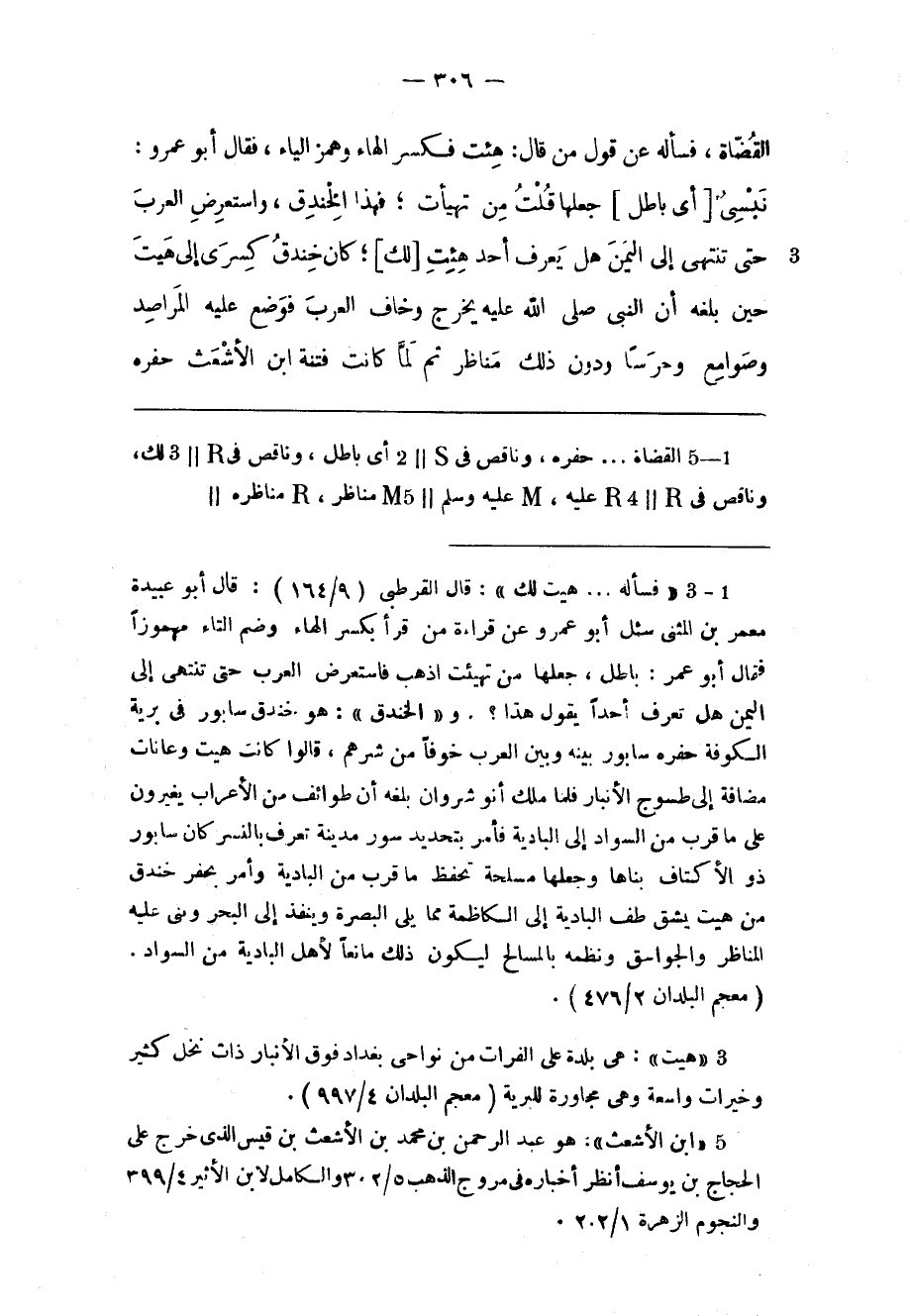 (1) «فسأله ... هيت لك» : قال القرطبي (9/ 164) : قال أبو عبيدة معمر بن المثنى سئل أبو عمرو عن قراءة من قرأ بكسر الهاء وضم التاء مهموزا فتمال أبو عمر: باطل، جعلها من تهيئت اذهب فاستعرض العرب حتى تنتهى إلى اليمن هل تعرف أحدا يقول هذا؟ و «الخندق» : هو خندق سابور فى برية الكوفة حفره سابور بينه وبين العرب خوفا من شرهم، قالوا كانت هيت وعانات مضافة إلى طسوج الأنبار فلما ملك أنو شروان بلغه أن طوائف من الأعراب يغيرون على ما قرب من السواد إلى البادية فأمر بتحديد سور مدينة تعرف بالنسر كان سابور ذو الأكتاف بناها وجعلها مسلحة تحفظ ما قرب من البادية وأمر بحفر خندق من هيت يشق طف البادية إلى الكاظمة مما يلى البصرة وينفذ إلى البحر وبنى عليه المناظر والجواسق ونظمه بالمسالح ليكون ذلك مانعا لأهل البادية من السواد.