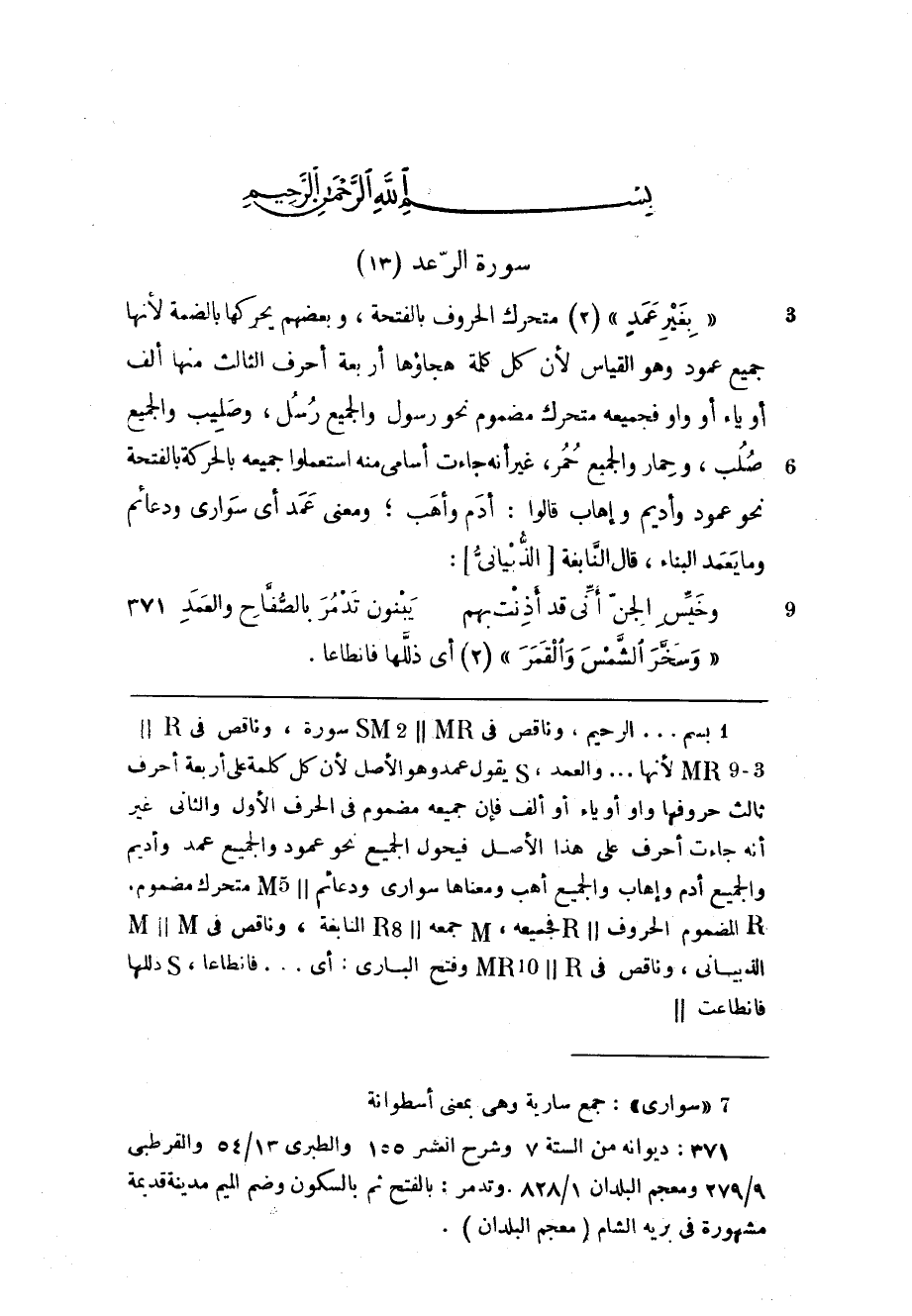 «بِغَيْرِ عَمَدٍ» (2) متحرك الحروف بالفتحة، وبعضهم يحركها بالضمة لأنها جميع عمود وهو القياس لأن كل كلمة هجاؤها أربعة أحرف الثالث منها ألف أو ياء أو واو فجميعه متحرك مضموم نحو رسول والجميع رسل، وصليب والجميع صلب، وحمار والجميع حمر، غير أنه جاءت أسامى منه استعملوا جميعه بالحركة بالفتحة نحو عمود وأديم وإهاب قالوا: أدم وأهب ومعنى عمد أي سوارى «1» ودعائم وما يعمد البناء، قال النّابغة [الذّبيانىّ] :