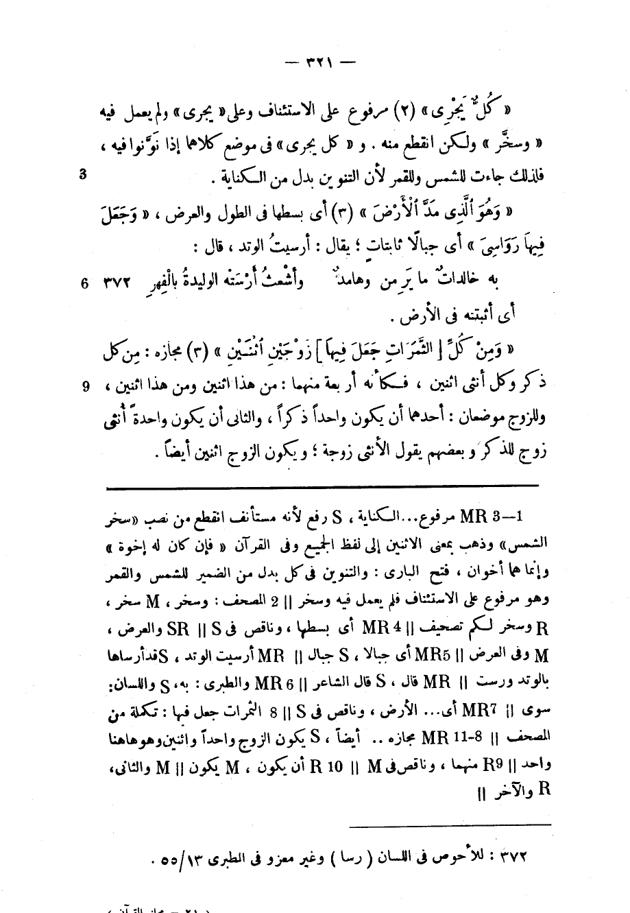 «كُلٌّ يَجْرِي» (2) مرفوع على الاستئناف وعلى «يجرى» ولم يعمل فيه «وَسَخَّرَ» ولكن انقطع منه. و «كُلٌّ يَجْرِي» فى موضع كلاهما إذا نوّنوا فيه، فلذلك جاءت للشمس وللقمر لأن التنوين بدل من الكناية.