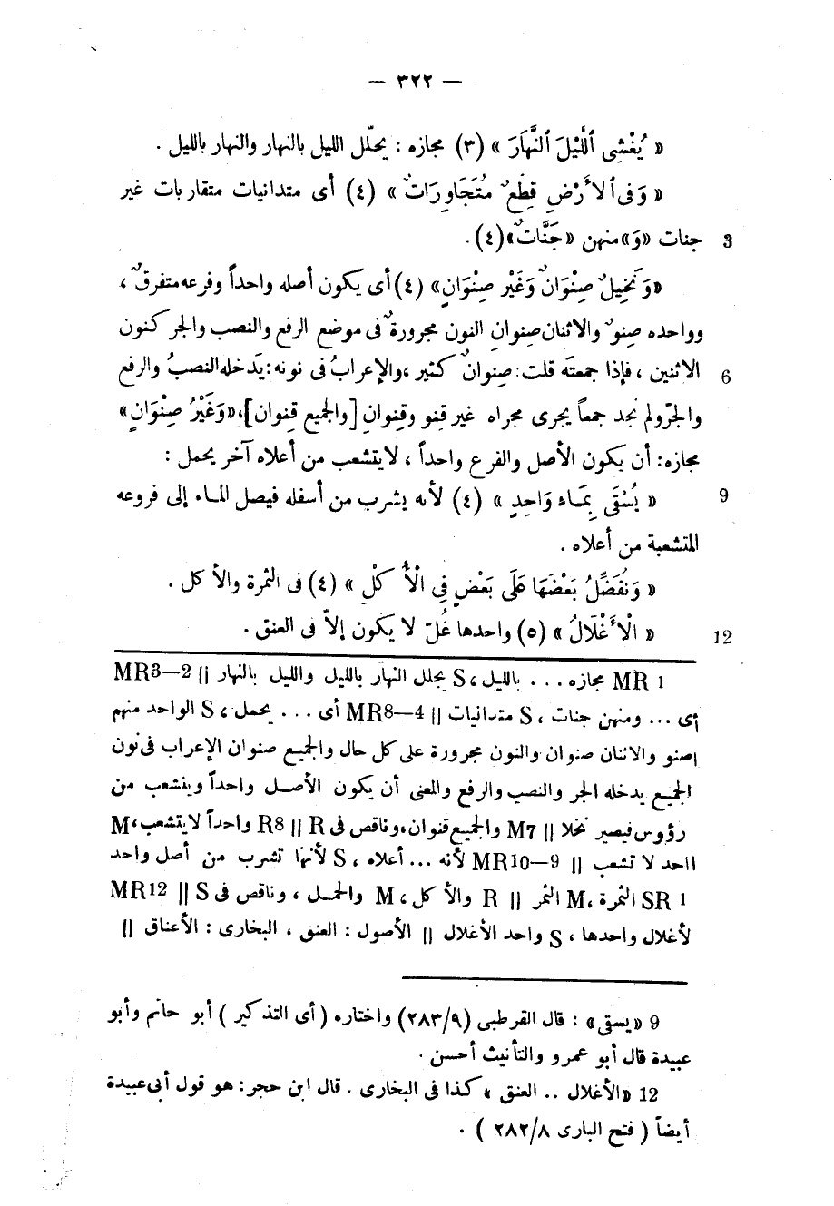 «وَنَخِيلٌ صِنْوانٌ وَغَيْرُ صِنْوانٍ» (4) أي يكون أصله واحدا وفرعه متفرق، وواحده صنو والاثنان صنوان النون مجرورة فى موضع الرفع والنصب والجر كنون الاثنين، فإذا جمعته قلت: صنوان كثير، والإعراب فى نونه: يدخله النصب والرفع والجرّ ولم نجد جمعا يجرى مجراه غير قنو وقنوان [والجميع قنوان] ، «وَغَيْرُ صِنْوانٍ» مجازه: أن يكون الأصل والفرع واحدا، لا يتشعب من أعلاه آخر يحمل: