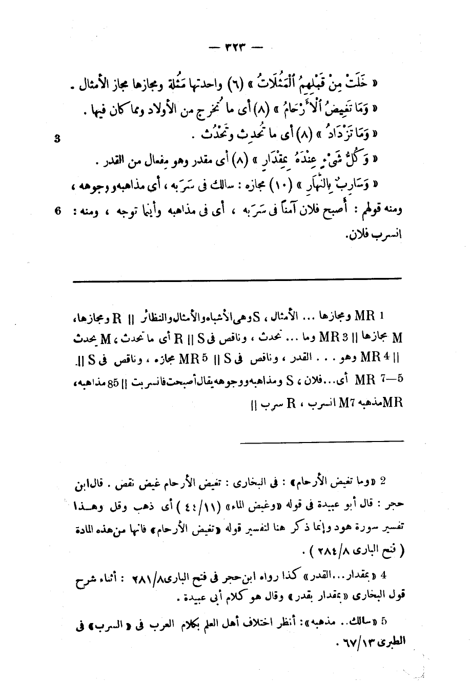(1) «وما تغيض الأرحام» : فى البخاري: تغيض الأرحام غيض نقص. قال ابن حجر: قال أبو عبيدة فى قوله «وغيض الماء» (11/ 44) أي ذهب وقل وهذا تفسير سورة هود وإنما ذكر هنا لتفسير قوله «تغيض الأرحام» فانها من هذه المادة (فتح الباري 8/ 284) .