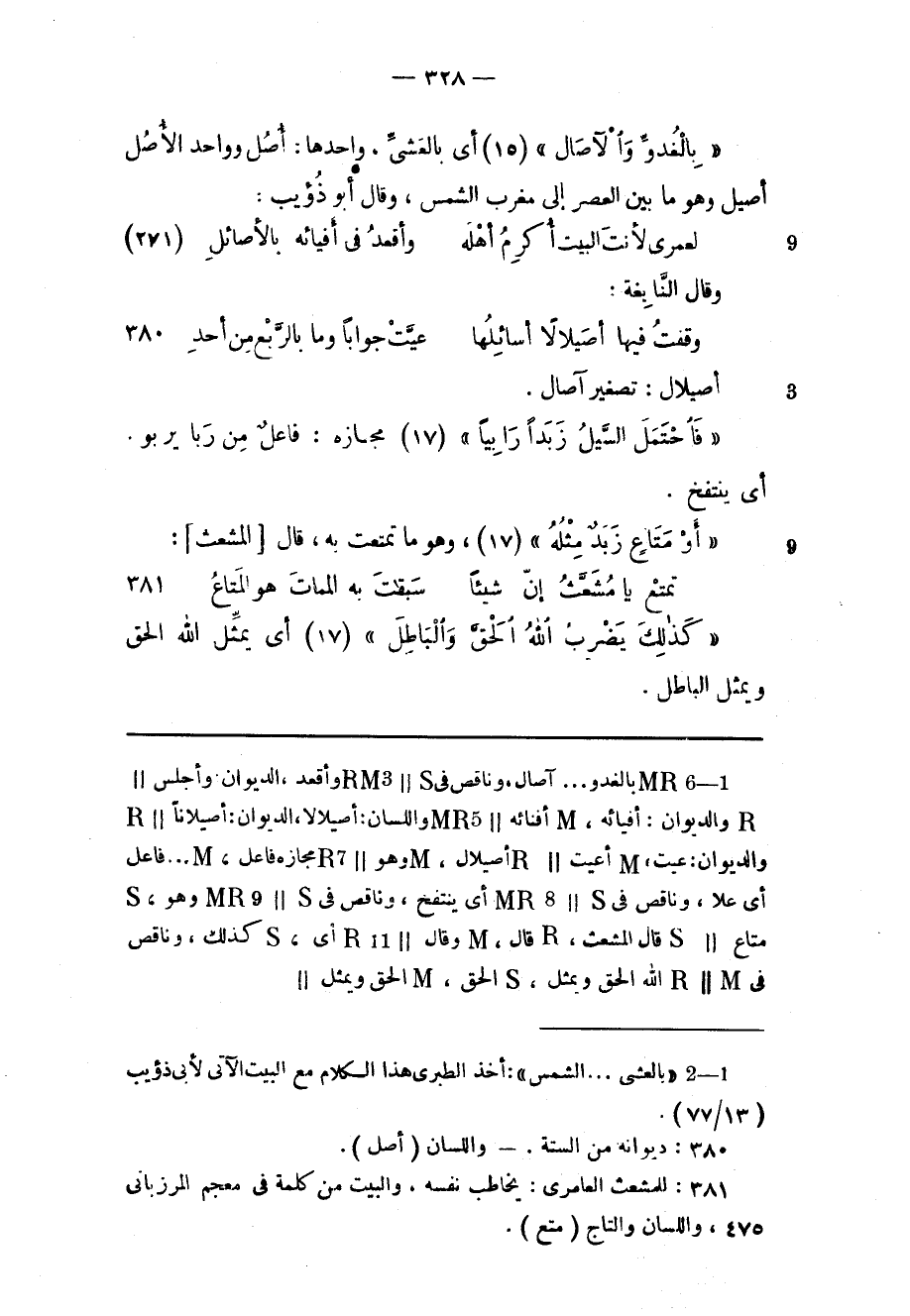 (1) «بالعشي ... الشمس» : أخذ الطبري هذا الكلام مع البيت الآتي لأبى ذؤيب (13/ 77) .