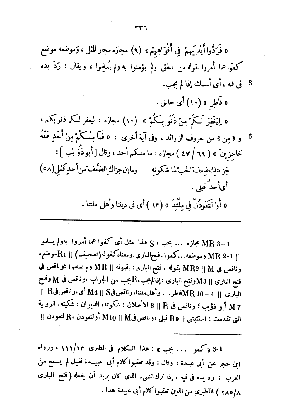 (1) «كفوا ... يجب» : هذا الكلام فى الطبري 13/ 111، ورواه ابن حجر عن أبى عبيدة، وقال: وقد تعقبوا كلام أبى عبيدة فقيل لم يسمع من العرب: رد يده فى فيه، إذا ترك الشيء الذي كان يريد أن يفعله (فتح الباري 8/ 285) فالطبرى من الذين تعقبوا كلام أبى عبيدة هذا.