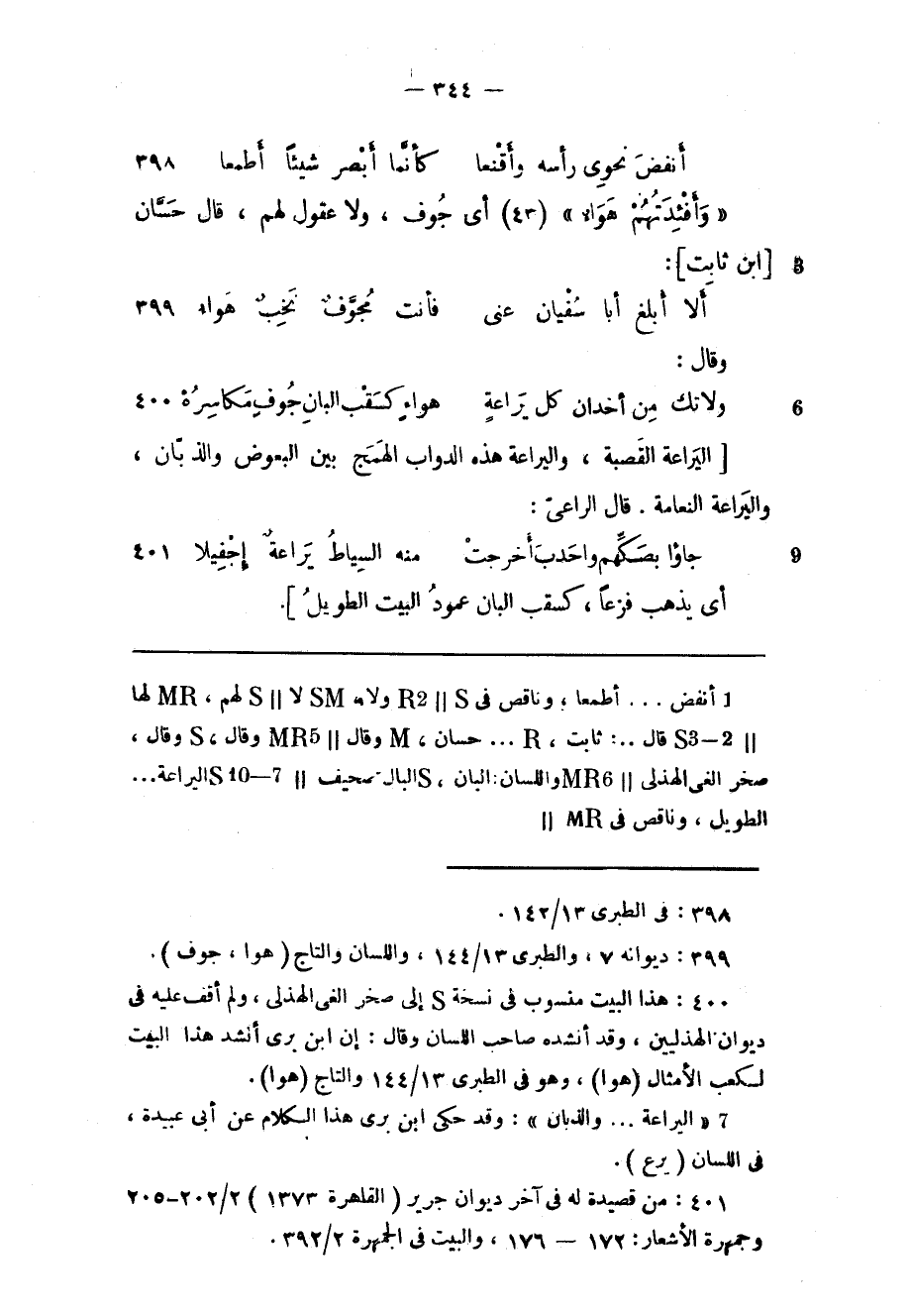 (3) : هذا البيت منسوب فى نسخة إلى صخر الغى الهذلي، ولم أقف عليه فى ديوان الهذليين، وقد أنشده صاحب اللسان وقال: إن ابن برى أنشد هذا البيت لكعب الأمثال (هوا) ، وهو فى الطبري 13/ 144 والتاج (هوا) . [.....]