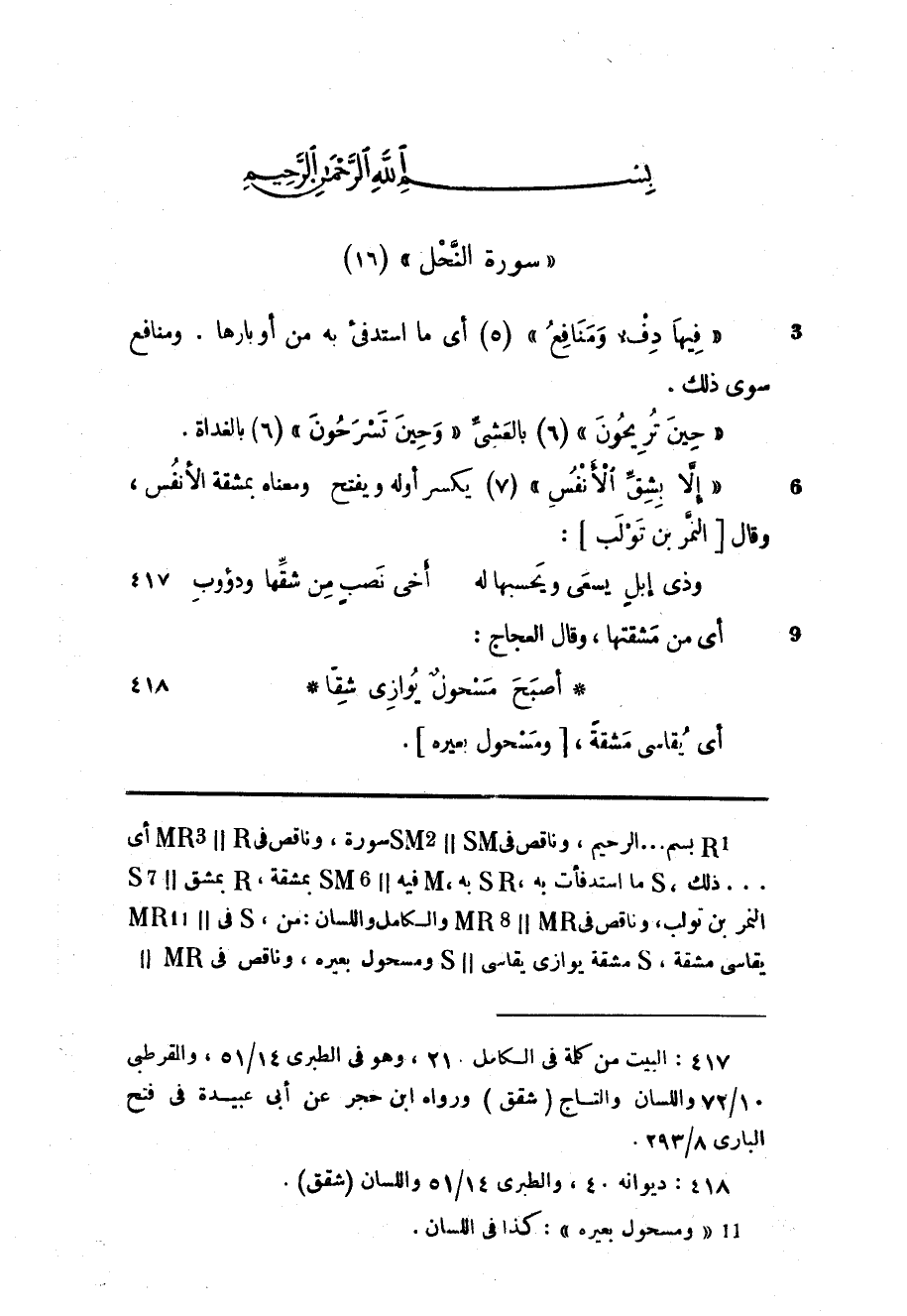 «إِلَّا بِشِقِّ الْأَنْفُسِ» (7) يكسر أوله ويفتح ومعناه بمشقة الأنفس، وقال [النّمر بن تولب] :