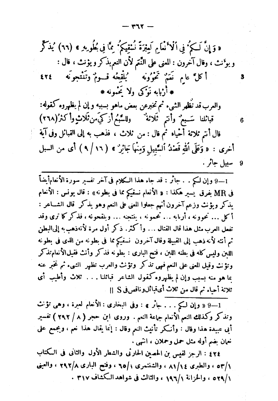 (2) «وإن لكم ... جائر» : وفى البخاري: الأنعام لعبرة، وهى تؤنث وتذكر وكذلك النعم الأنعام جماعة النعم. وروى ابن حجر (8/ 292) تفسير أبى عبيدة هذا وقال: وأنكر تأنيث النعم وقال: إنما يقال هذا نعم، ويجمع على نعمان بضم أوله مثل حمل وحملان، انتهى.