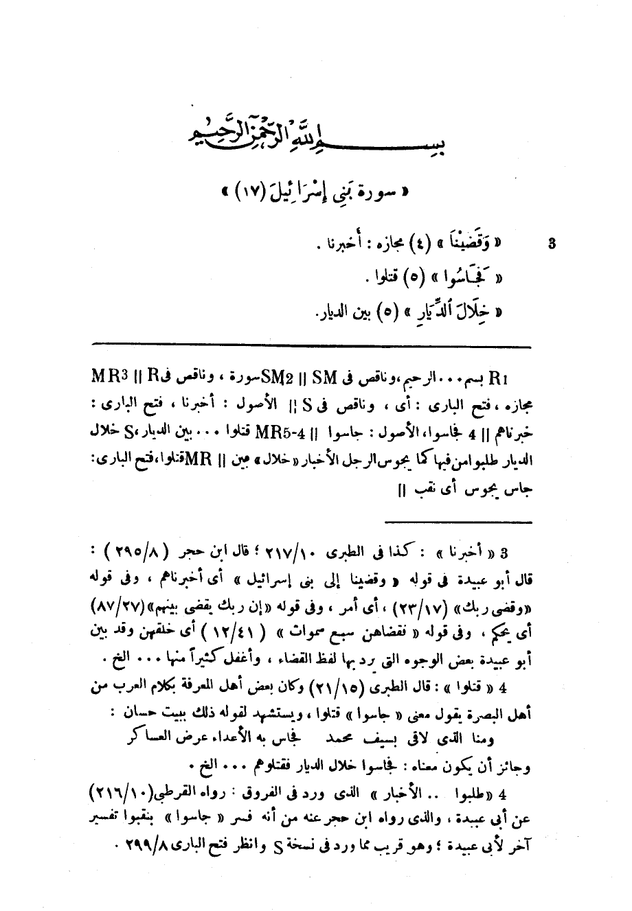 قال أبو عبيدة فى قوله «وقضينا إلى بنى إسرائيل» أي أخبرناهم، وفى قوله «وقضى ربك» (17/ 23) ، أي أمر، وفى قوله «إن ربك يقضى بينهم» (27/ 87) أي يحكم، وفى قوله «فقضاهن سبع سموات» (41/ 12) أي خلقهن وقد بين أبو عبيدة بعض الوجوه التي يرد بها لفظ القضاء، وأغفل كثيرا منها ... إلخ.