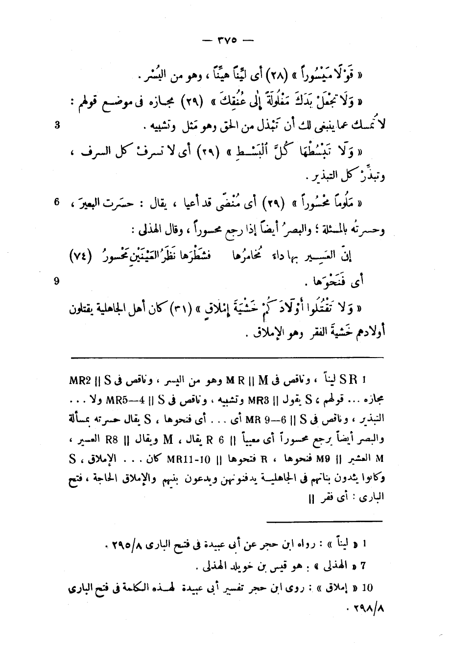 (3) «إملاق» : روى ابن حجر تفسير أبى عبيدة لهذه الكلمة فى فتح الباري 8/ 298.