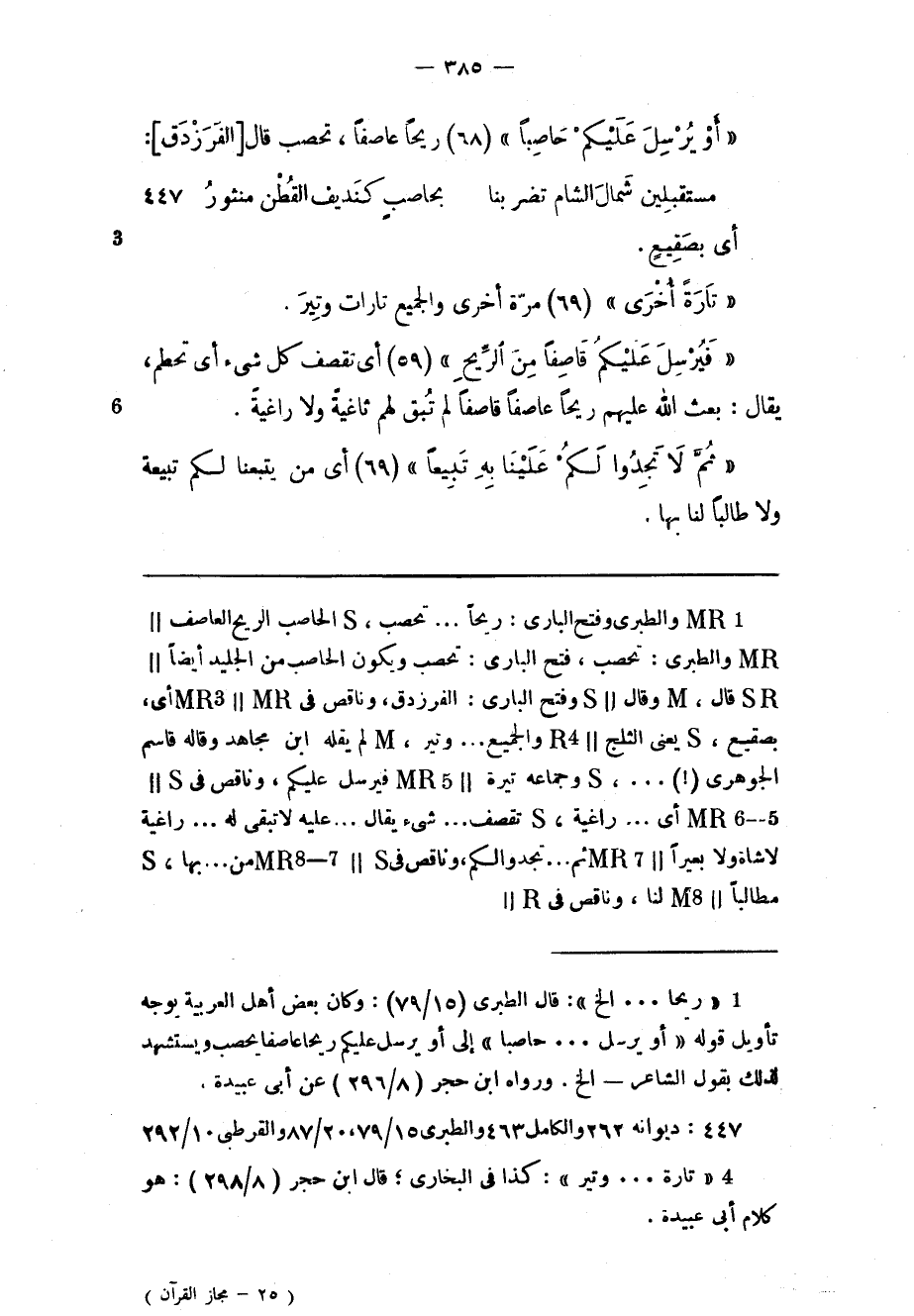 (1) «ريحا ... إلخ» : قال الطبري (15/ 79) : وكان بعض أهل العربية بوجه تأويل قوله «أو يرسل ... حاصبا» إلى أو يرسل عليكم ريحا عاصفا يحصب ويستشهد لذلك بقول الشاعر- إلخ. ورواه ابن حجر (8/ 296) عن أبى عبيدة.