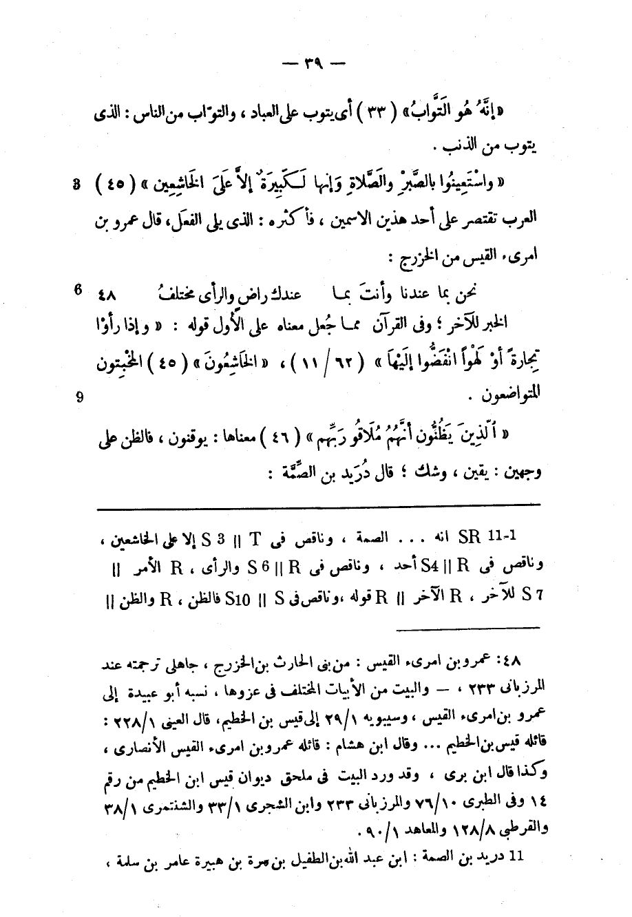 «وَاسْتَعِينُوا بِالصَّبْرِ وَالصَّلاةِ وَإِنَّها لَكَبِيرَةٌ إِلَّا عَلَى الْخاشِعِينَ» (45) العرب تقتصر على أحد هذين الاسمين، فأكثره: الذي يلى الفعل، قال عمرو بن امرى، القيس من الخزرج: