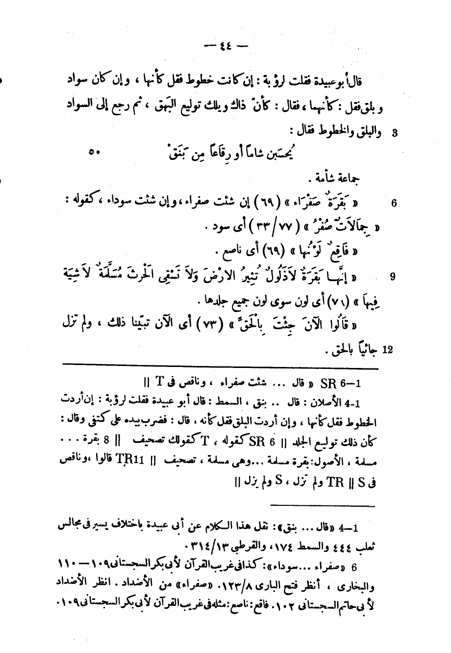(2) «صفراء ... سوداء» : كذا فى غريب القرآن لأبى بكر السجستاني 109- 110 والبخاري، أنظر فتح الباري 8/ 123. «صفراء» من الأضداد. انظر الأضداد لأبى حاتم السجستاني 102. فاقع: ناصع: مثله فى غريب القرآن لأبى بكر السجستاني 109.