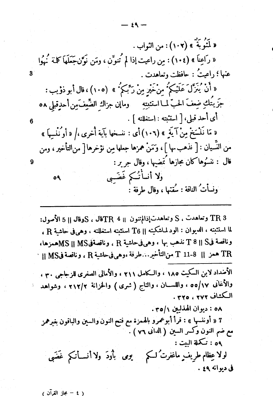 «ما نَنْسَخْ مِنْ آيَةٍ» (106) أي: ننسخها بآية أخرى، / «أَوْ نُنْسِها» «2» من النّسيان: [نذهب بها] ، ومن همزها جعلها من نؤخرها [من التأخير، ومن قال: ننسوها كان مجازها تمضيها، وقال جرير: