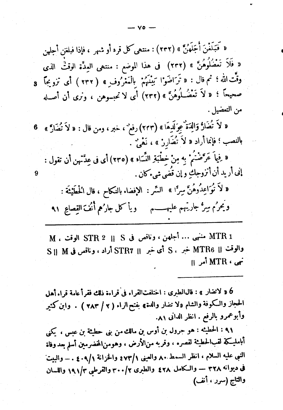 (1) «لا تُضَارَّ» : قال الطبري: اختلفت القراء فى قراءة ذلك فقرأ عامة قراء أهل الحجاز والكوفة والشام «لا تُضَارَّ والِدَةٌ» بفتح الراء (2/ 283) . وابن كثير وأبو عمرو بالرفع. انظر الداني 81.