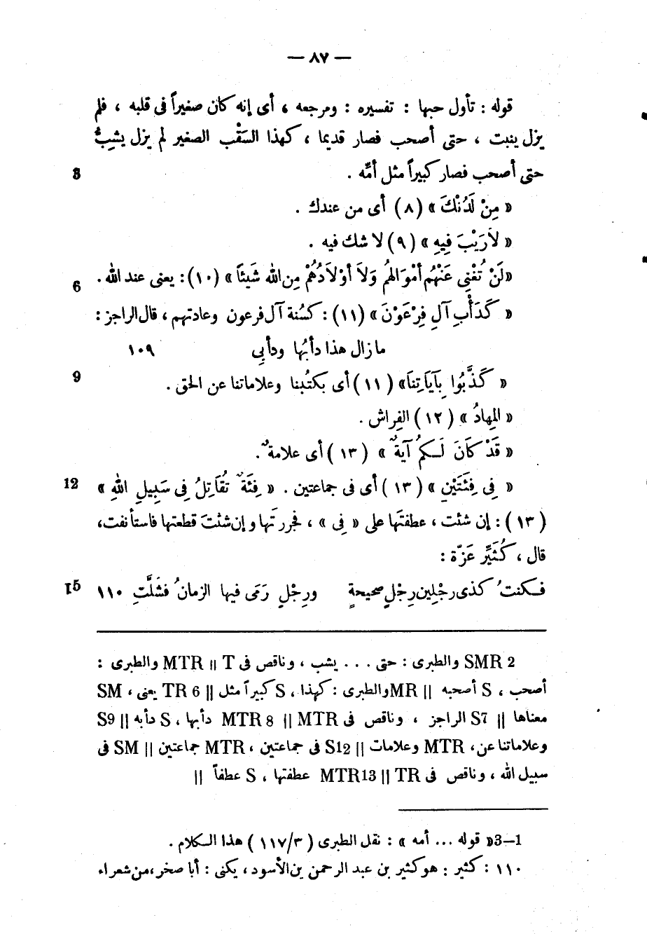 «فِي فِئَتَيْنِ» (13) أي فى جماعتين. «فِئَةٌ تُقاتِلُ فِي سَبِيلِ اللَّهِ» (13) : إن شئت، عطفتها على «فى» ، فجررتها وإن شئت قطعتها فاستأنفت، قال، كثير عزة: