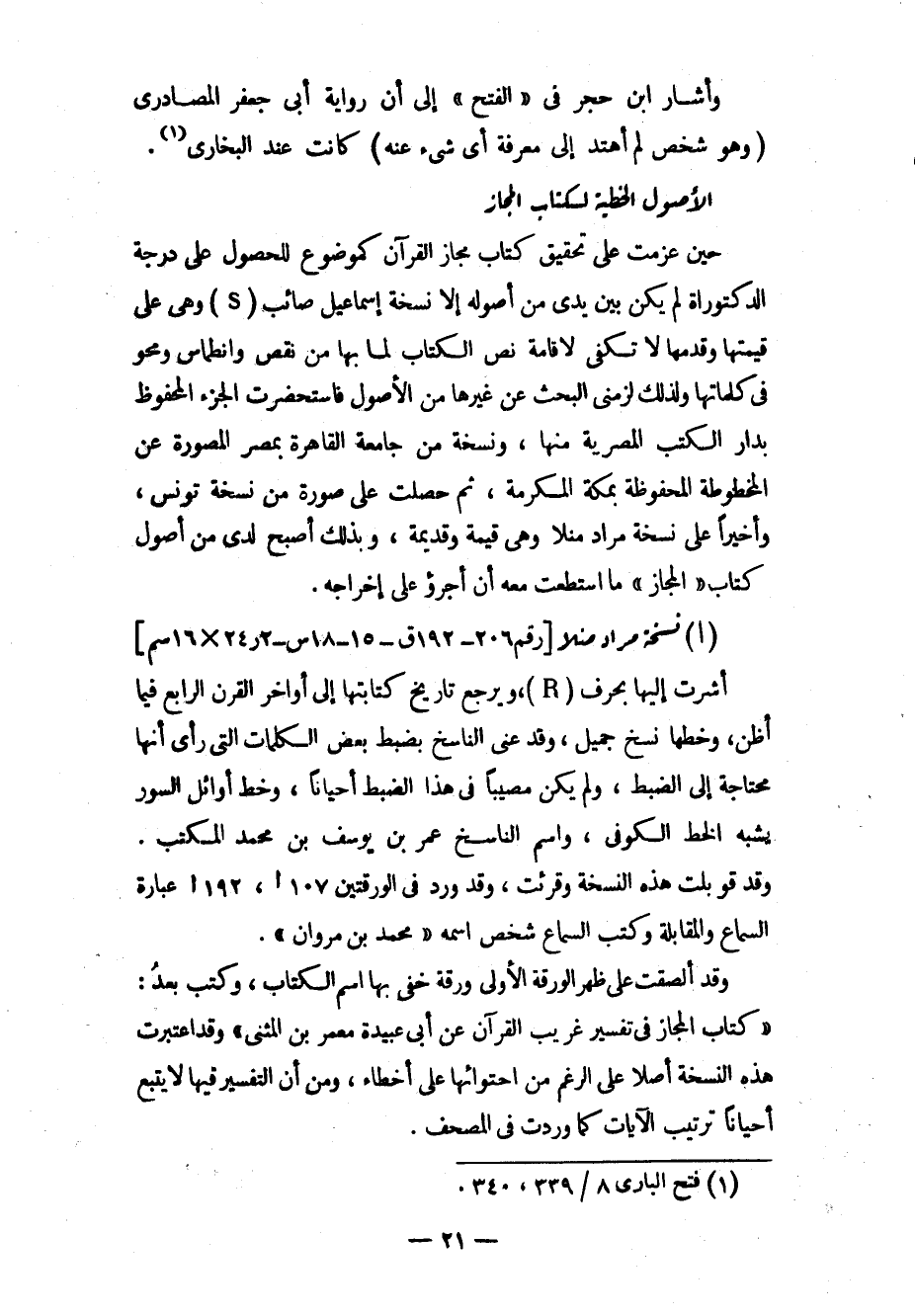 حين عزمت على تحقيق كتاب مجاز القرآن كموضوع للحصول على درجة الدكتوراة لم يكن بين يدى من أصوله إلا نسخة إسماعيل صائب () وهى على قيمتها وقدمها لا تكفى لاقامة نص الكتاب لما بها من نقص وانطماس ومحو فى كلماتها ولذلك لزمنى البحث عن غيرها من الأصول فاستحضرت الجزء المحفوظ بدار الكتب المصرية منها، ونسخة من جامعة القاهرة بمصر المصورة عن المخطوطة المحفوظة بمكة المكرمة، ثم حصلت على صورة من نسخة تونس، وأخيرا على نسخة مراد منلا وهى قيمة وقديمة، وبذلك أصبح لدى من أصول كتاب «المجاز» ما استطعت معه أن أجرؤ على إخراجه.