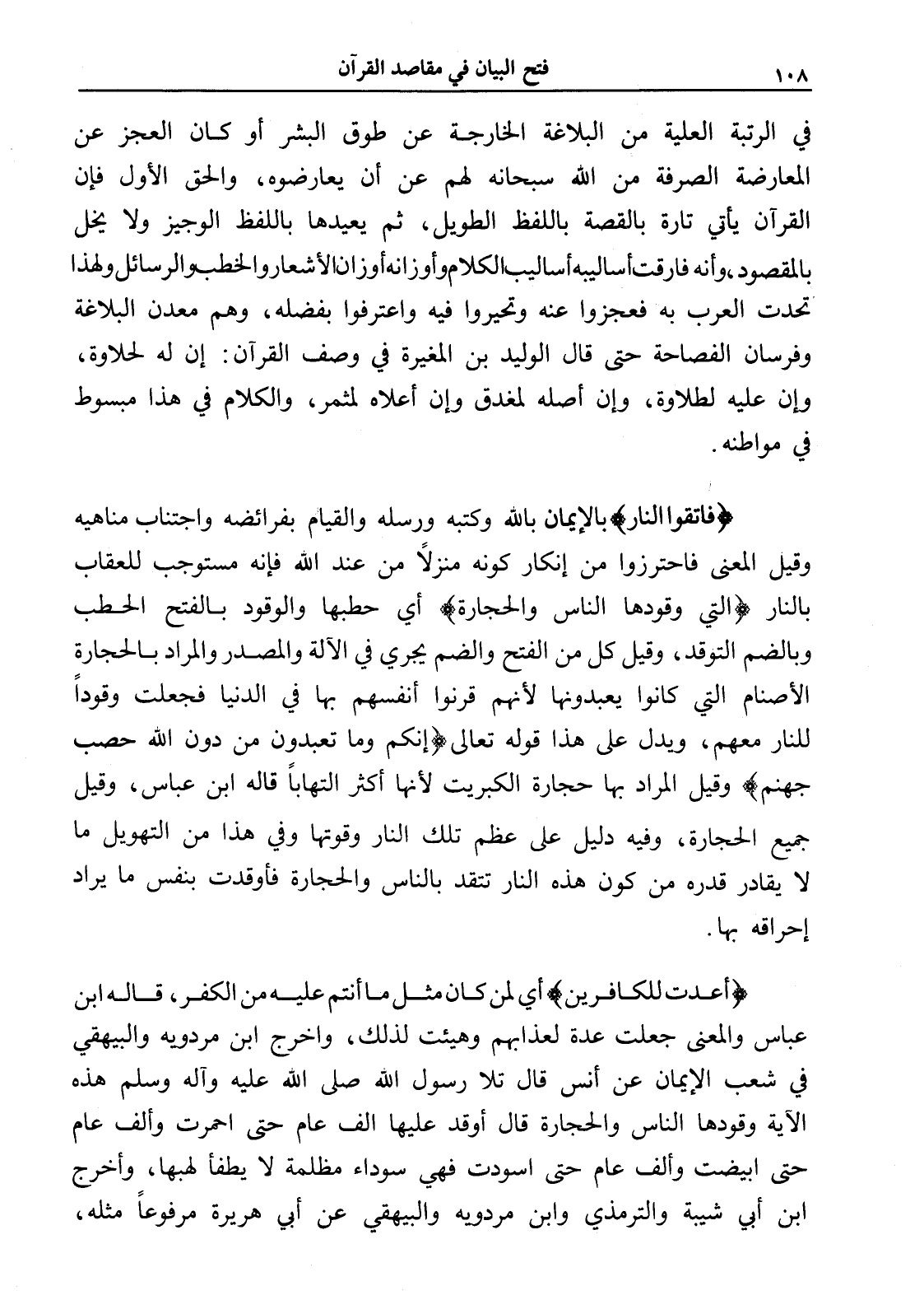 في الرتبة العلية من البلاغة الخارجة عن طوق البشر أو كان العجز عن المعارضة الصرفة من الله سبحانه لهم عن أن يعارضوه، والحق الأول فإن القرآن يأتي تارة بالقصة باللفظ الطويل، ثم يعيدها باللفظ الوجيز ولا يخل بالمقصود، وأنه فارقت أساليبه أساليب الكلام وأوزانه أوزان الأشعار والخطب والرسائل ولهذا تحدت العرب به فعجزوا عنه وتحيروا فيه واعترفوا بفضله، وهم معدن البلاغة وفرسان الفصاحة حتى قال الوليد بن المغيرة في وصف القرآن: إن له لحلاوة، وإن عليه لطلاوة، وإن أصله لمغدق وإن أعلاه لمثمر، والكلام في هذا مبسوط في مواطنه.